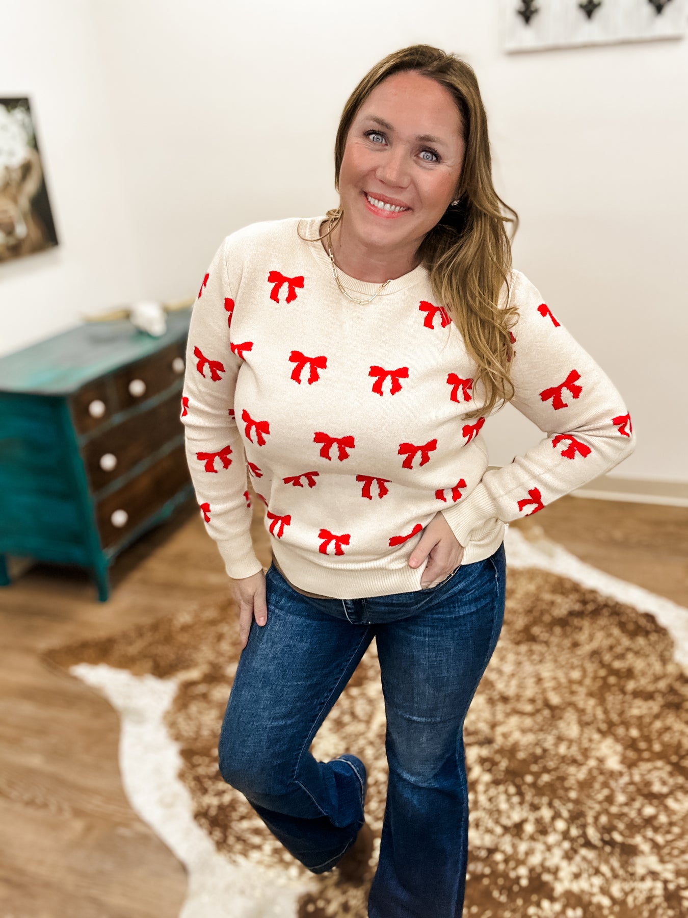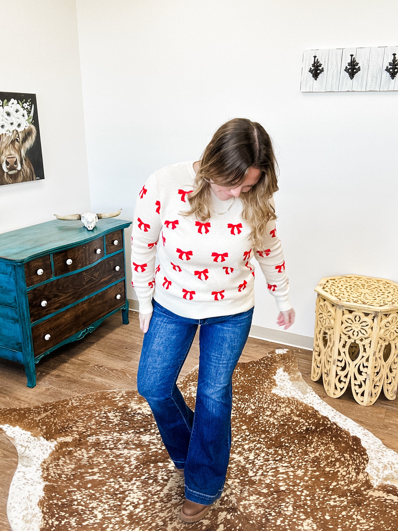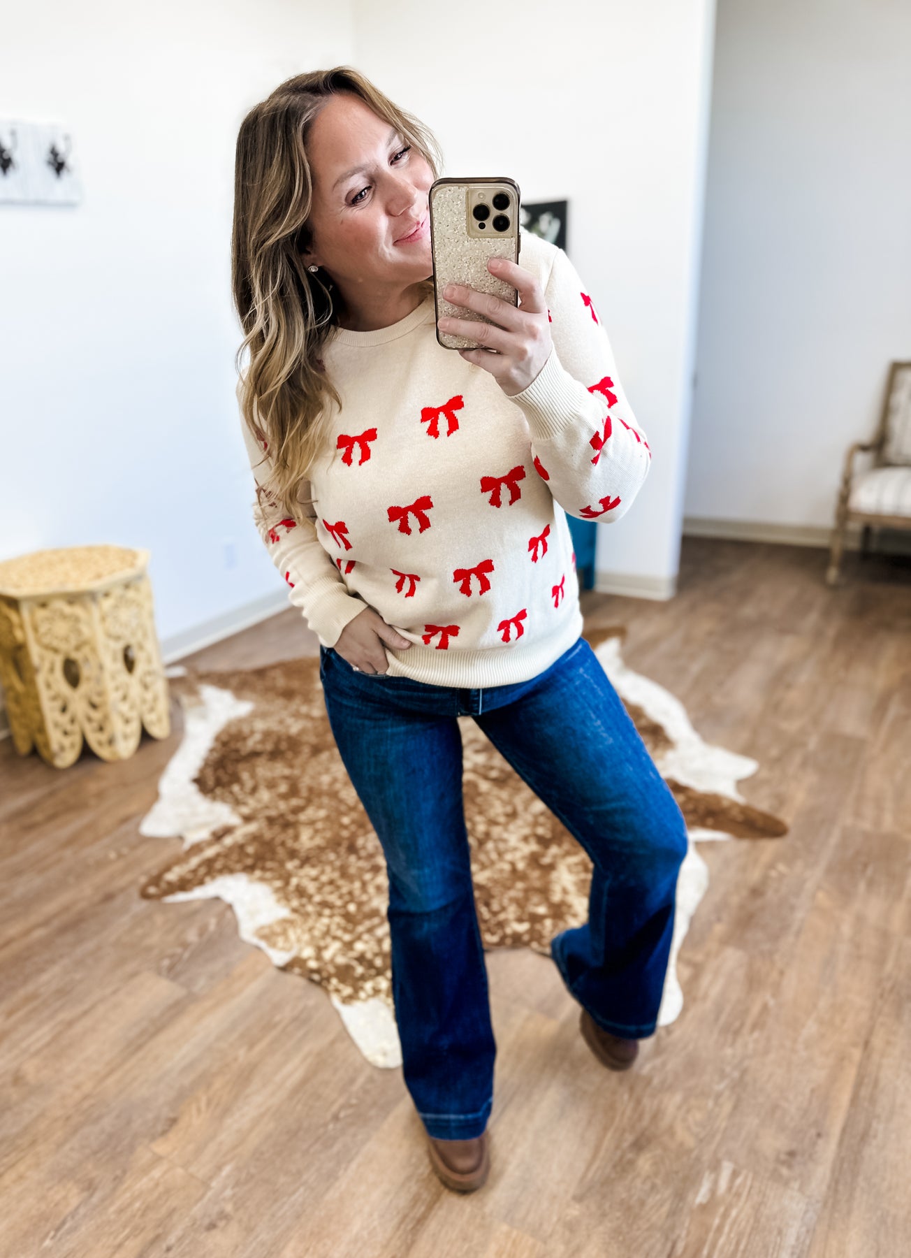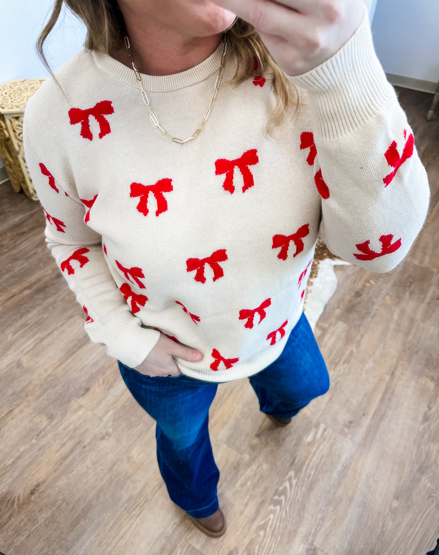 This sweater is pure charm. The soft cream knit and those little red bows create the sweetest, subtly festive look — feminine without feeling fussy. It’s one of those pieces that feels cheerful the moment you put it on, the kind you reach for when you want something pretty but still completely comfortable.