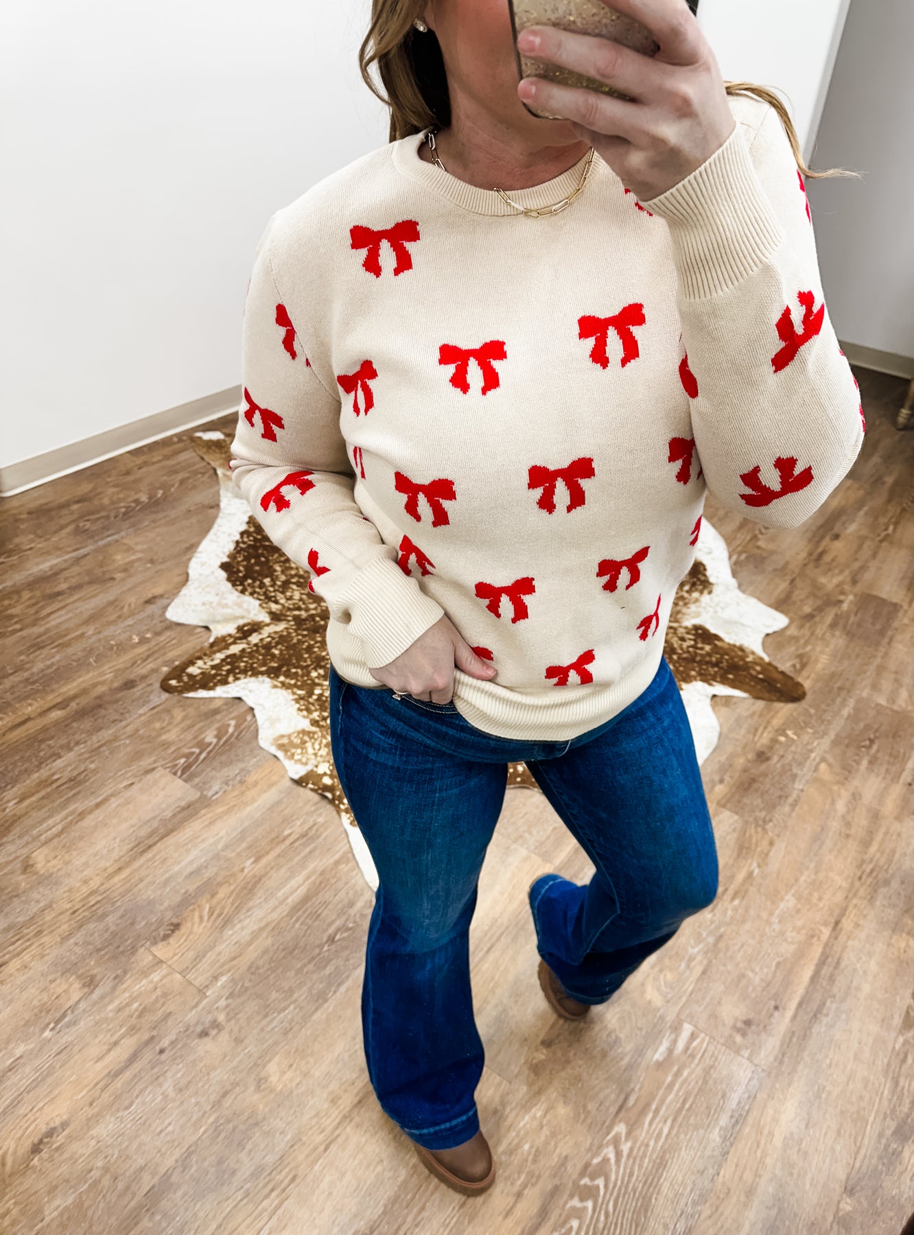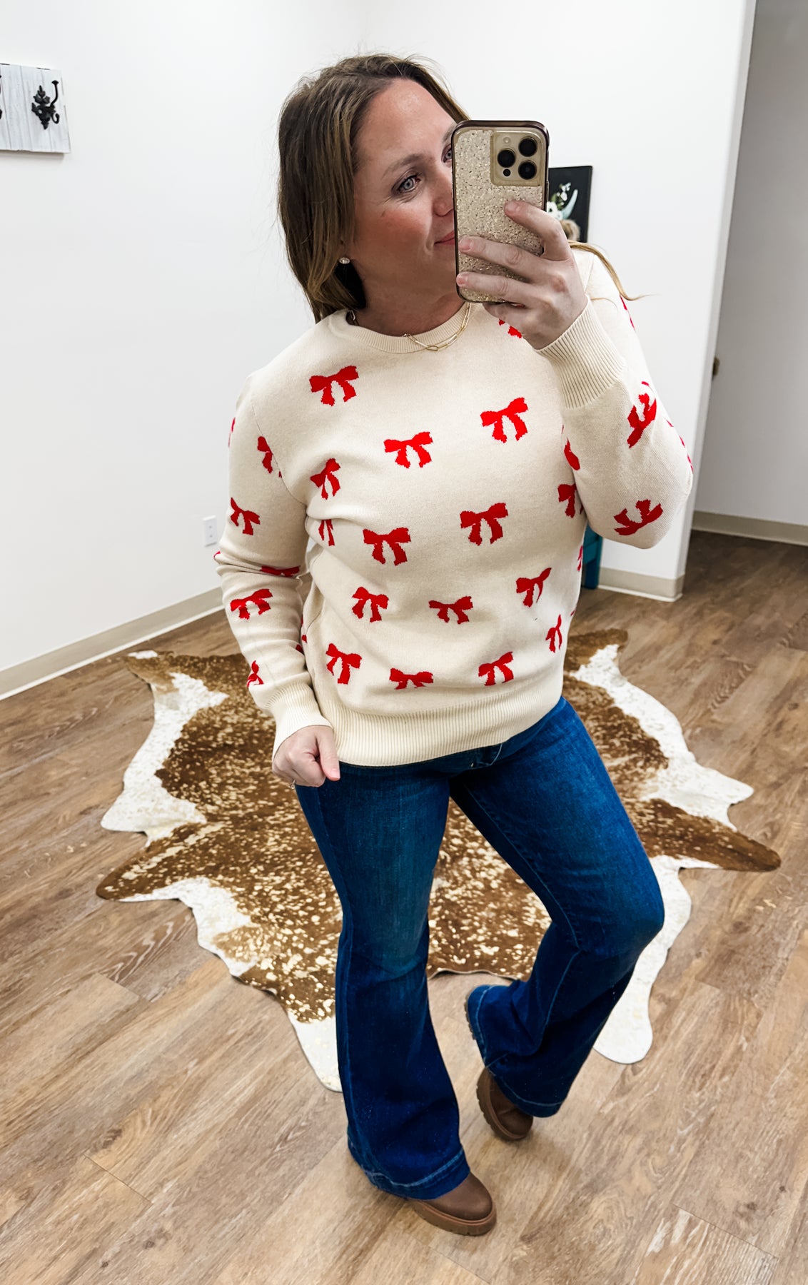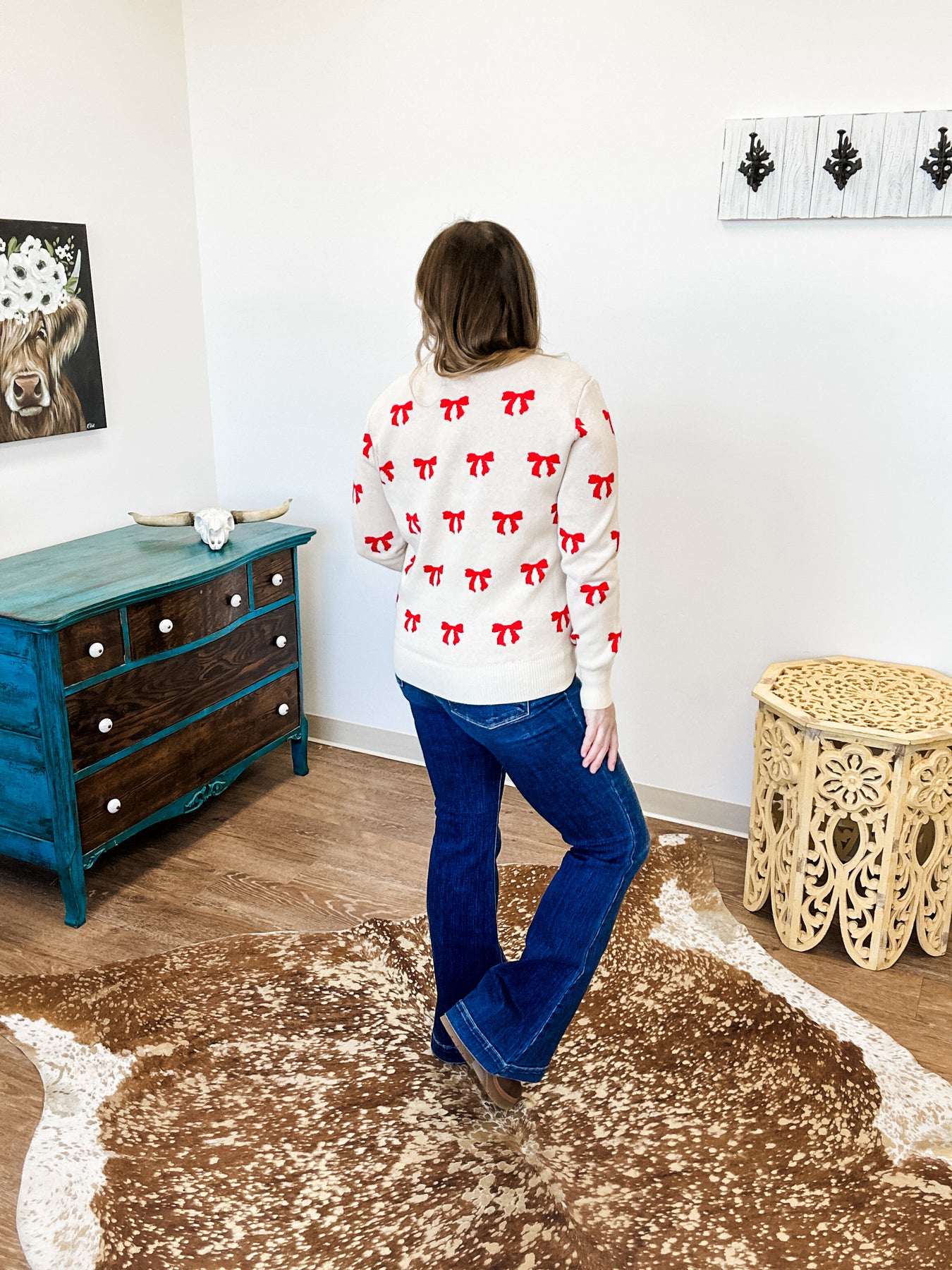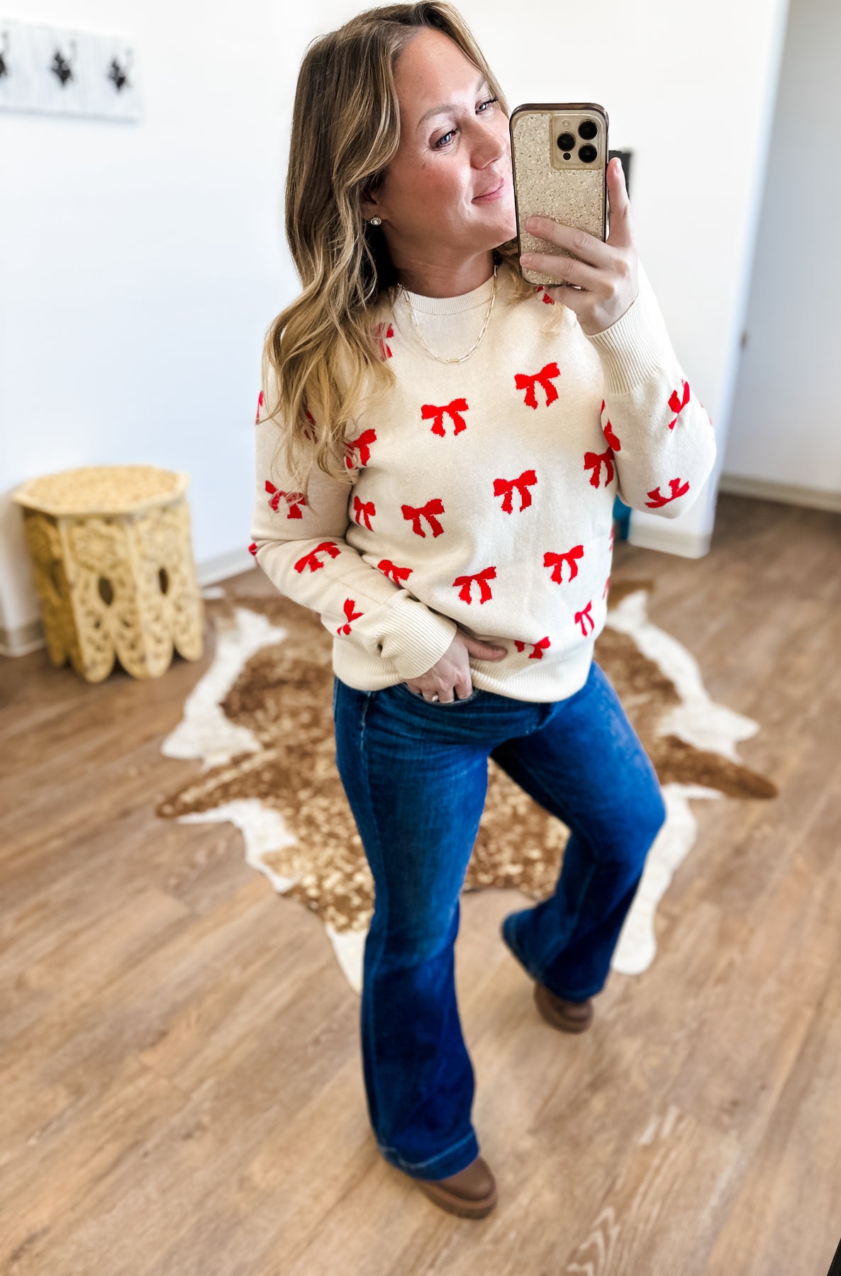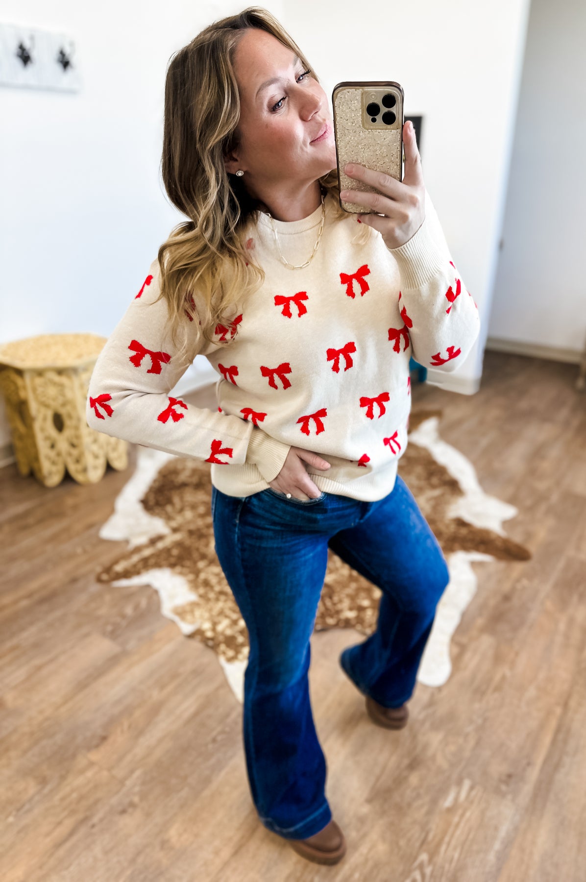 This sweater is pure charm. The soft cream knit and those little red bows create the sweetest, subtly festive look — feminine without feeling fussy. It’s one of those pieces that feels cheerful the moment you put it on, the kind you reach for when you want something pretty but still completely comfortable.