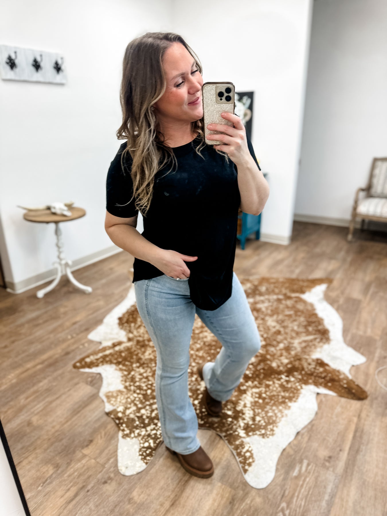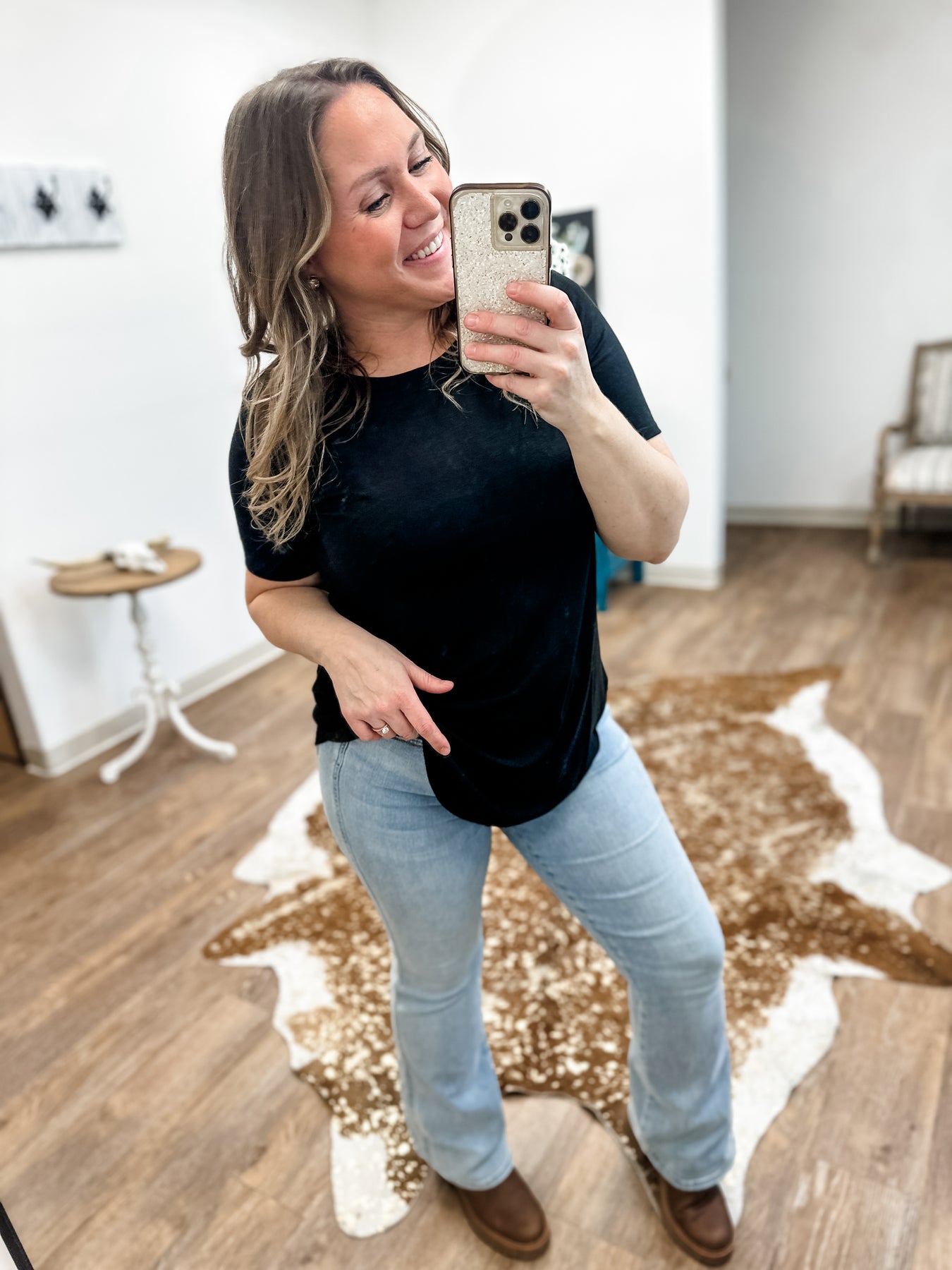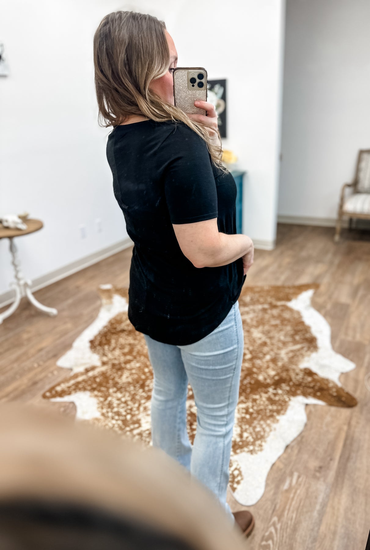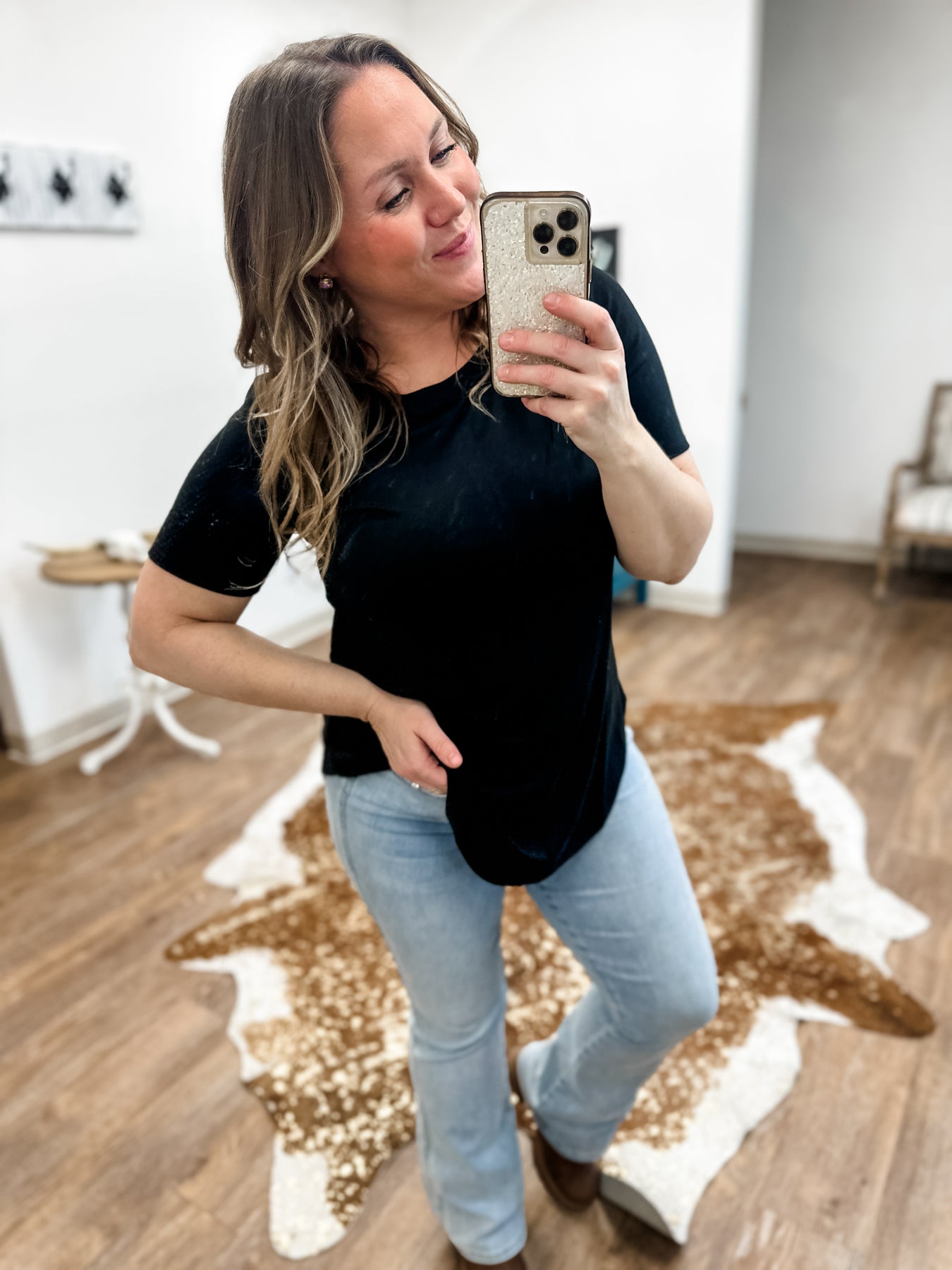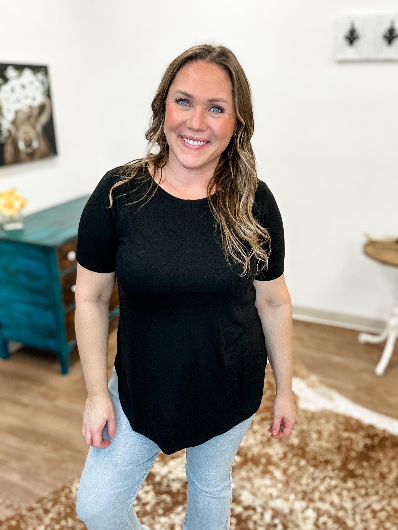 This is just one of those easy basics you’ll be glad you grabbed. The fabric is soft with a good amount of stretch, and the fit is relaxed without feeling boxy. The round hem gives it a little shape, so it sits nicely with jeans, shorts, or leggings — just a simple, comfortable tee that works for pretty much anything.