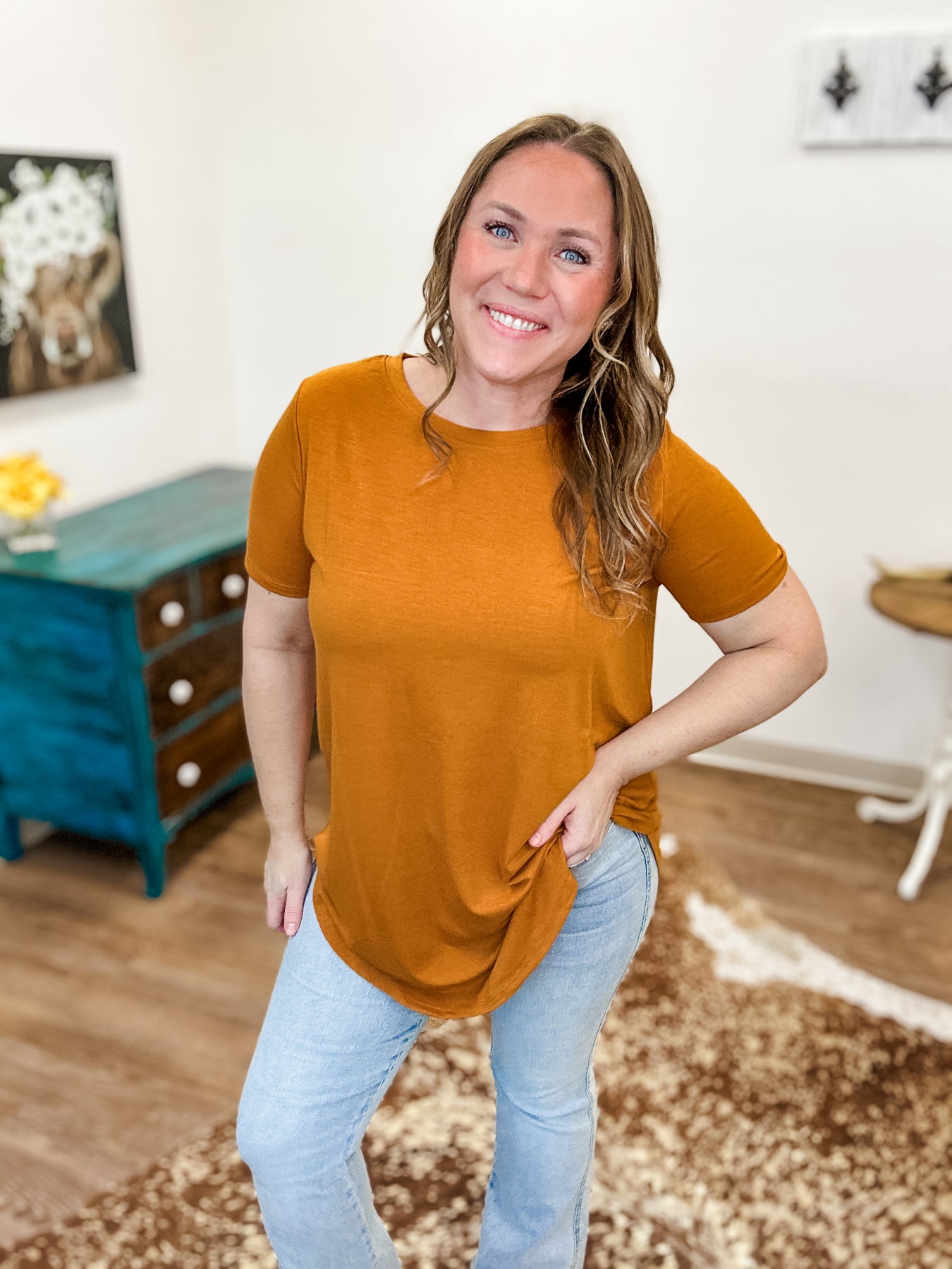 Regular price $22.80 Sale price $14.99 Save $7.81This is just one of those easy basics you’ll be glad you grabbed. The fabric is soft with a good amount of stretch, and the fit is relaxed without feeling boxy. The round hem gives it a little shape, so it sits nicely with jeans, shorts, or leggings — just a simple, comfortable tee that works for pretty much anything.