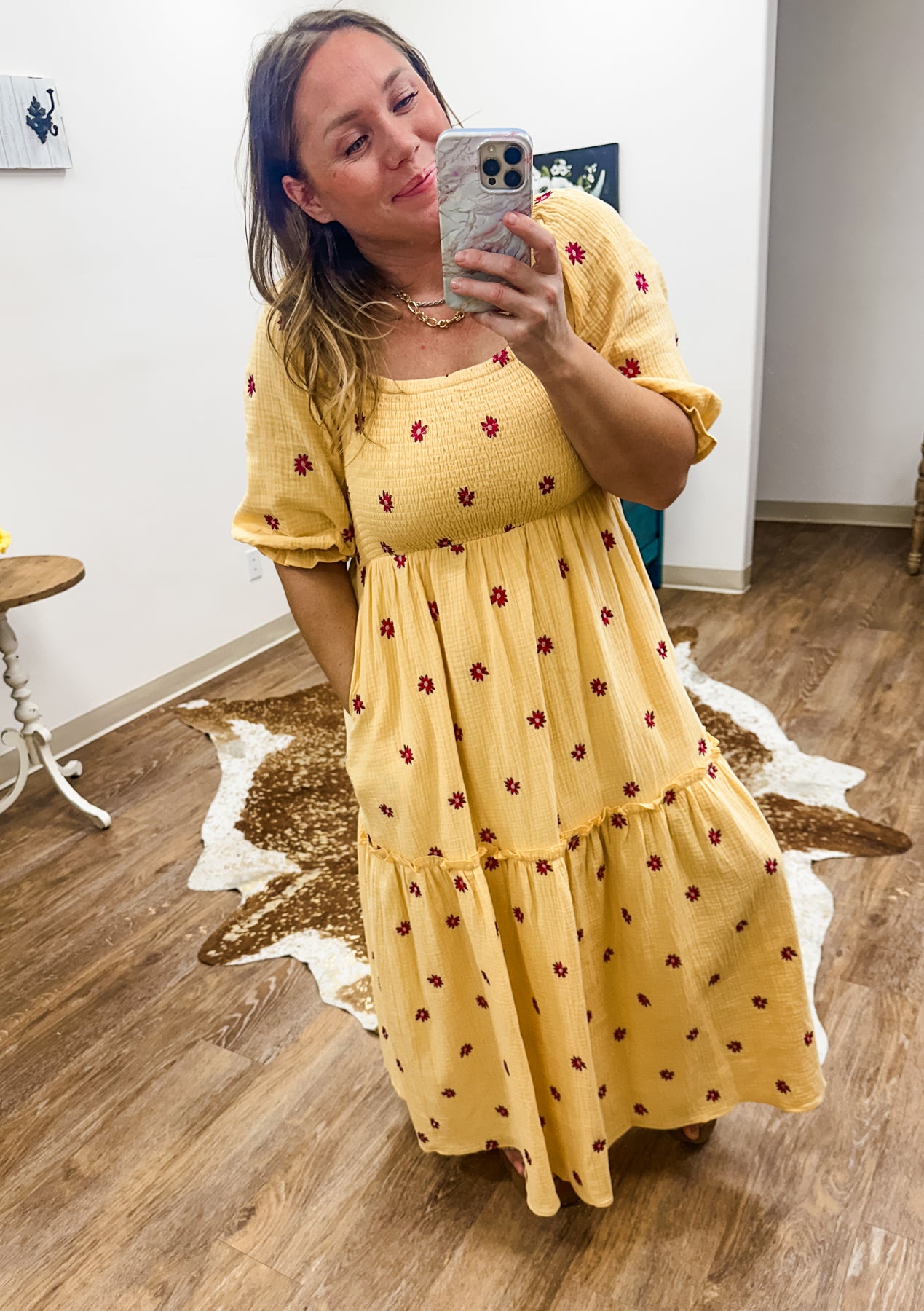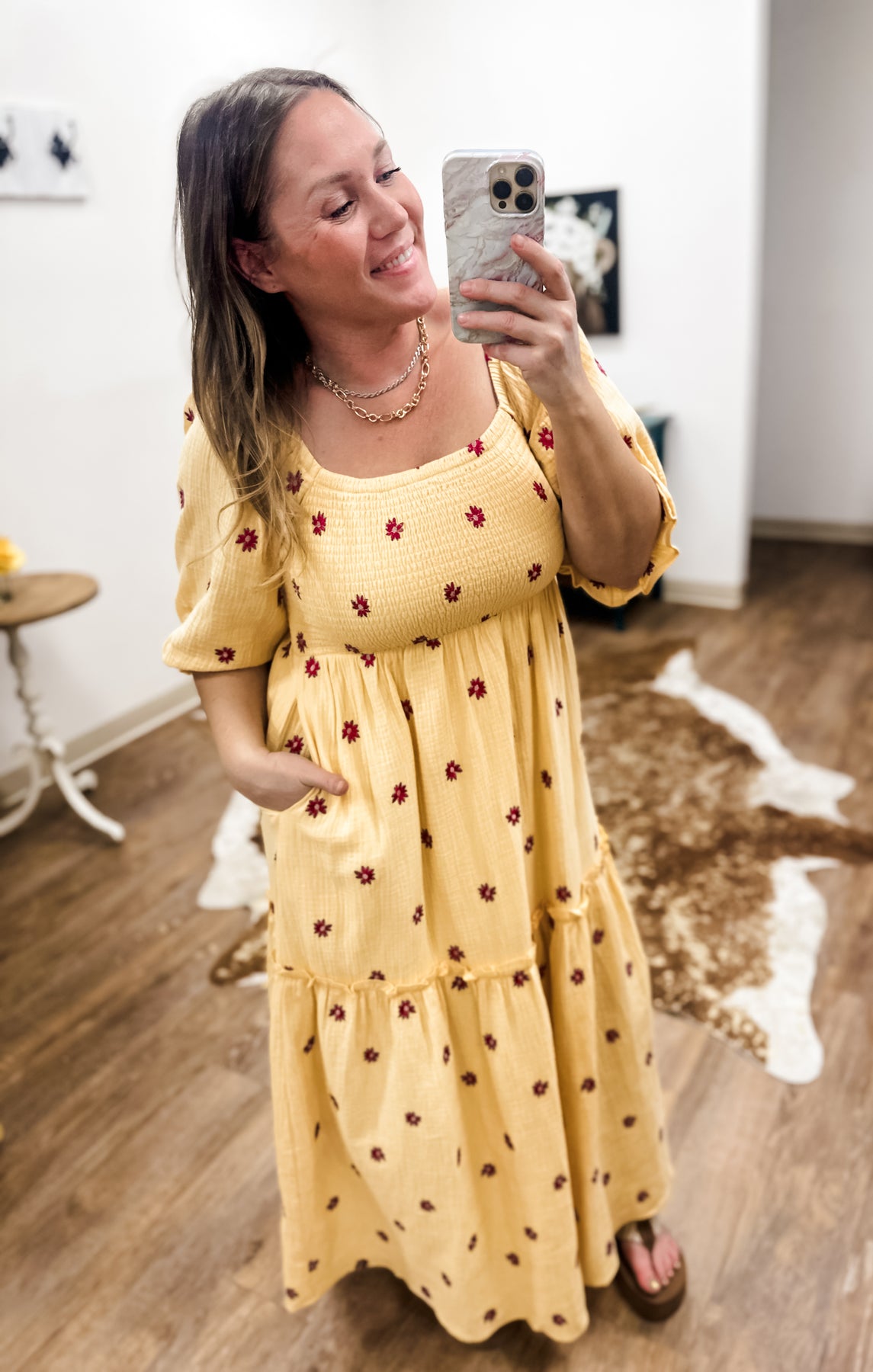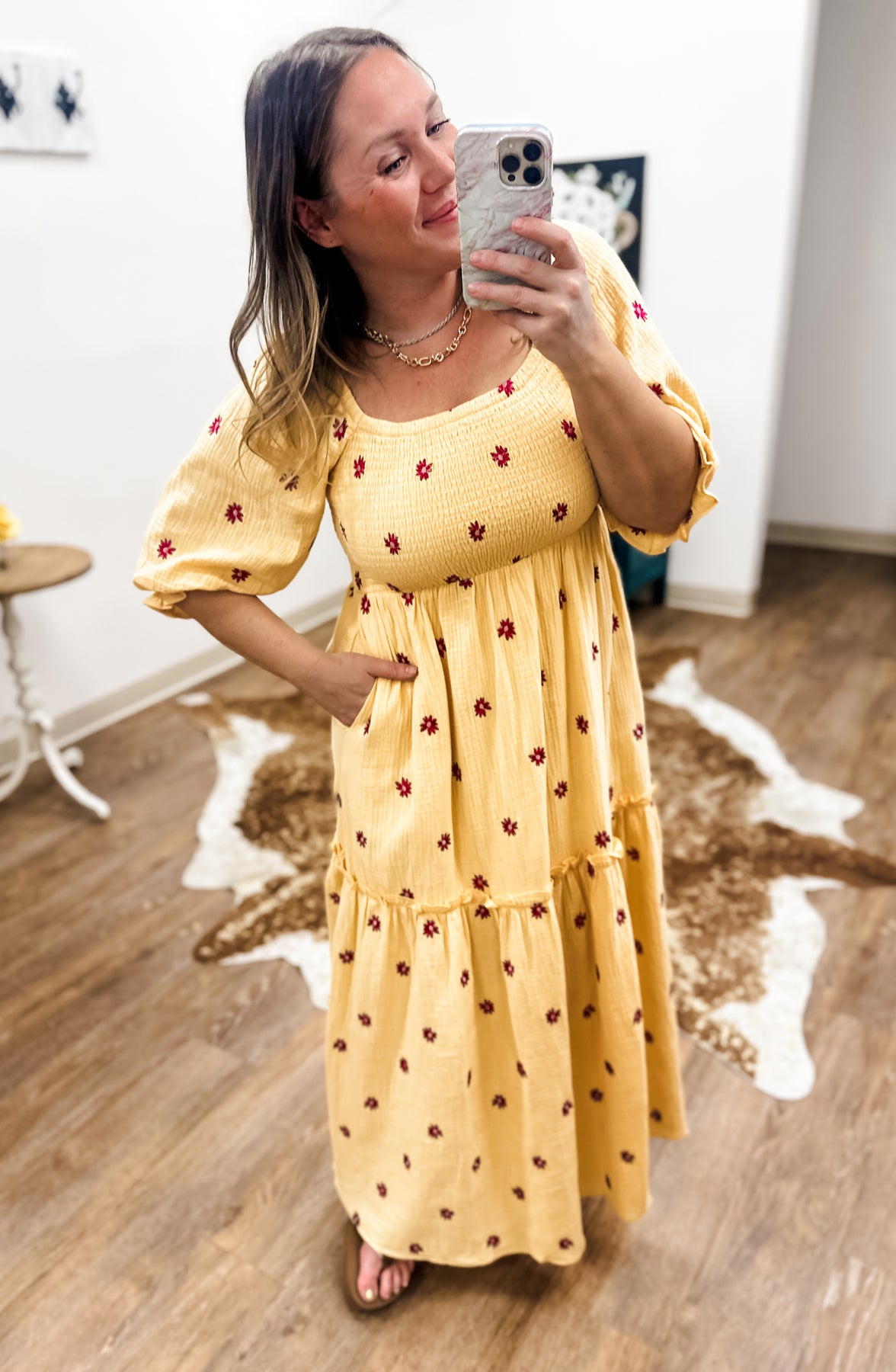Regular price $78.80There’s just something about this one… like sunshine you can actually wear. Soft yellow with the sweetest little floral details embroidered throughout, and that smocked bodice that hugs just right. She’s floaty, feminine, and has that “I feel really good today” energy the second you put her on.