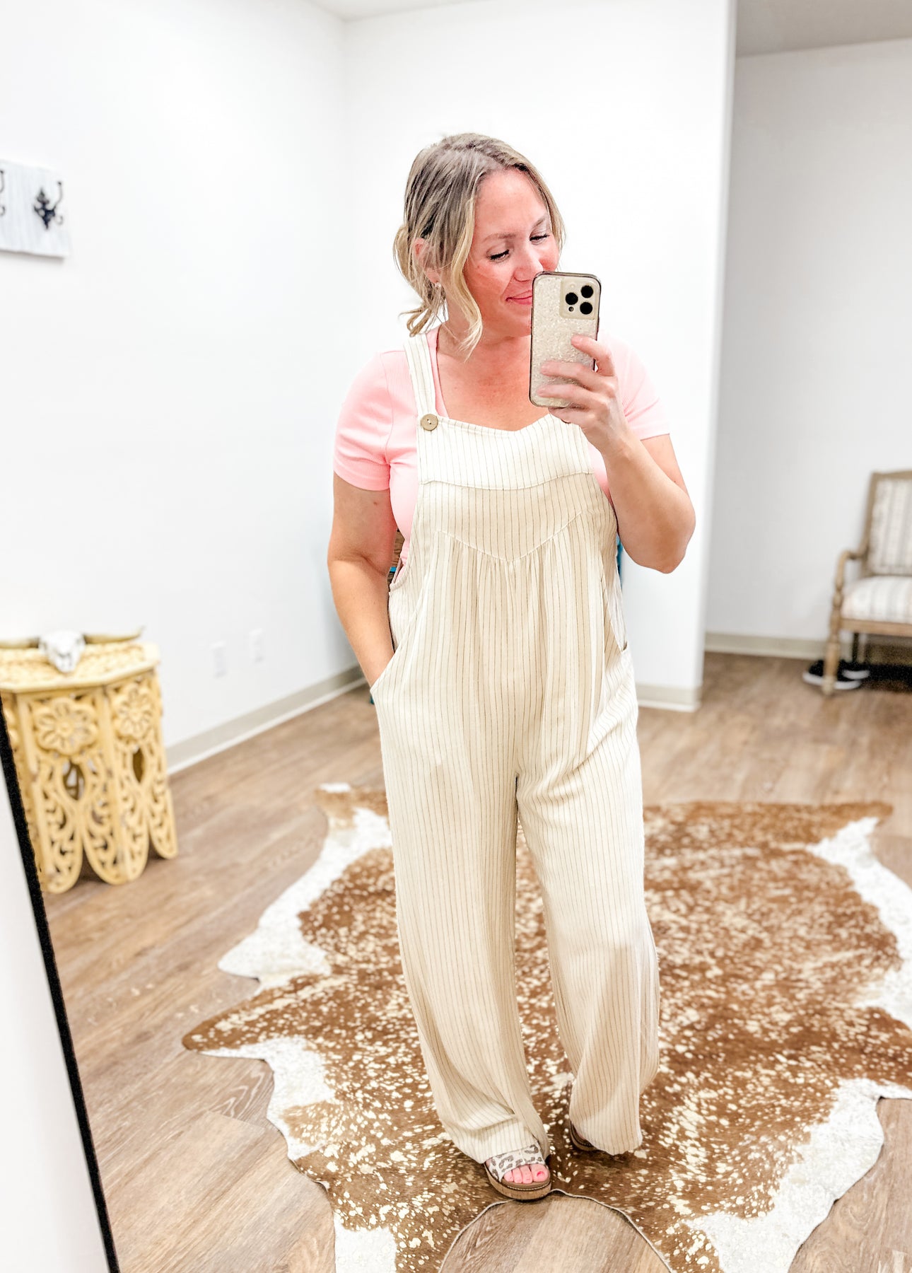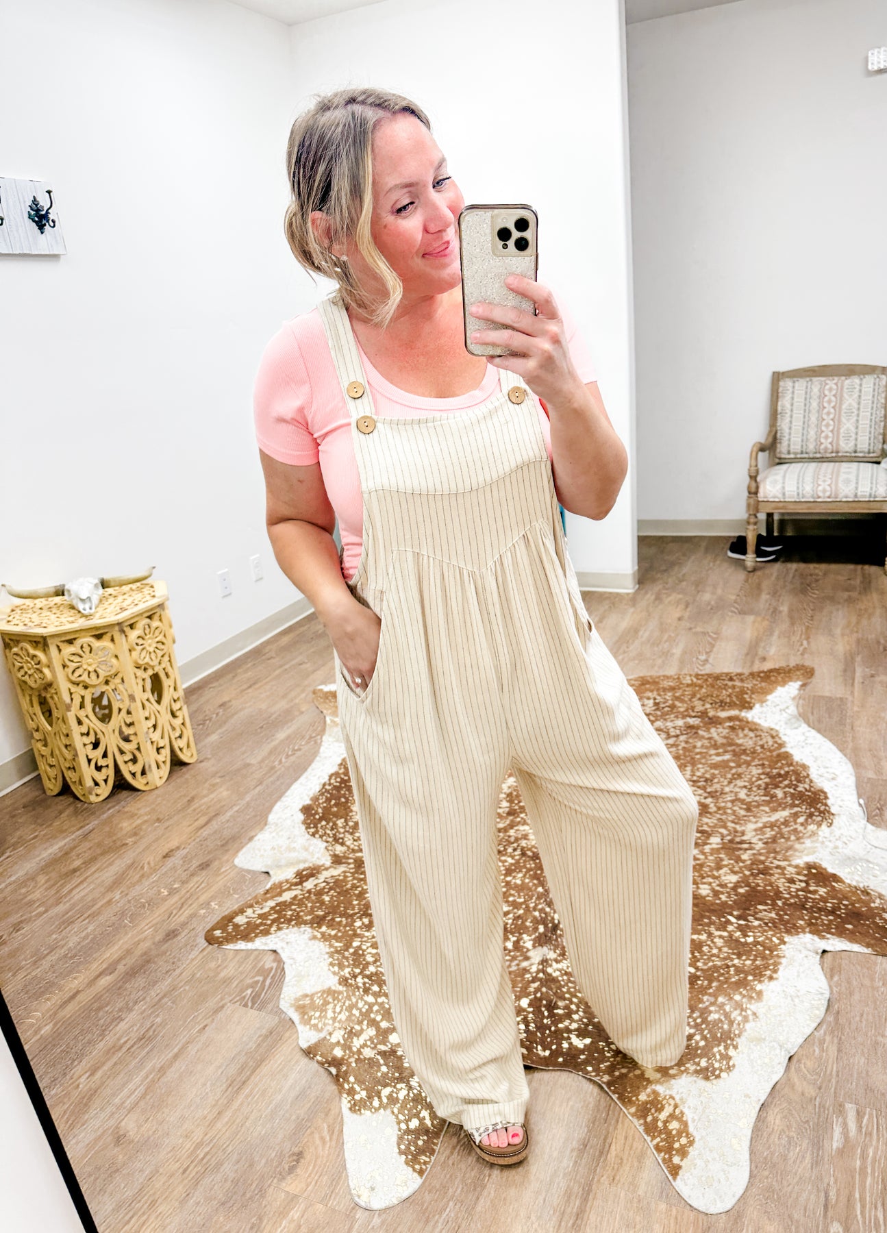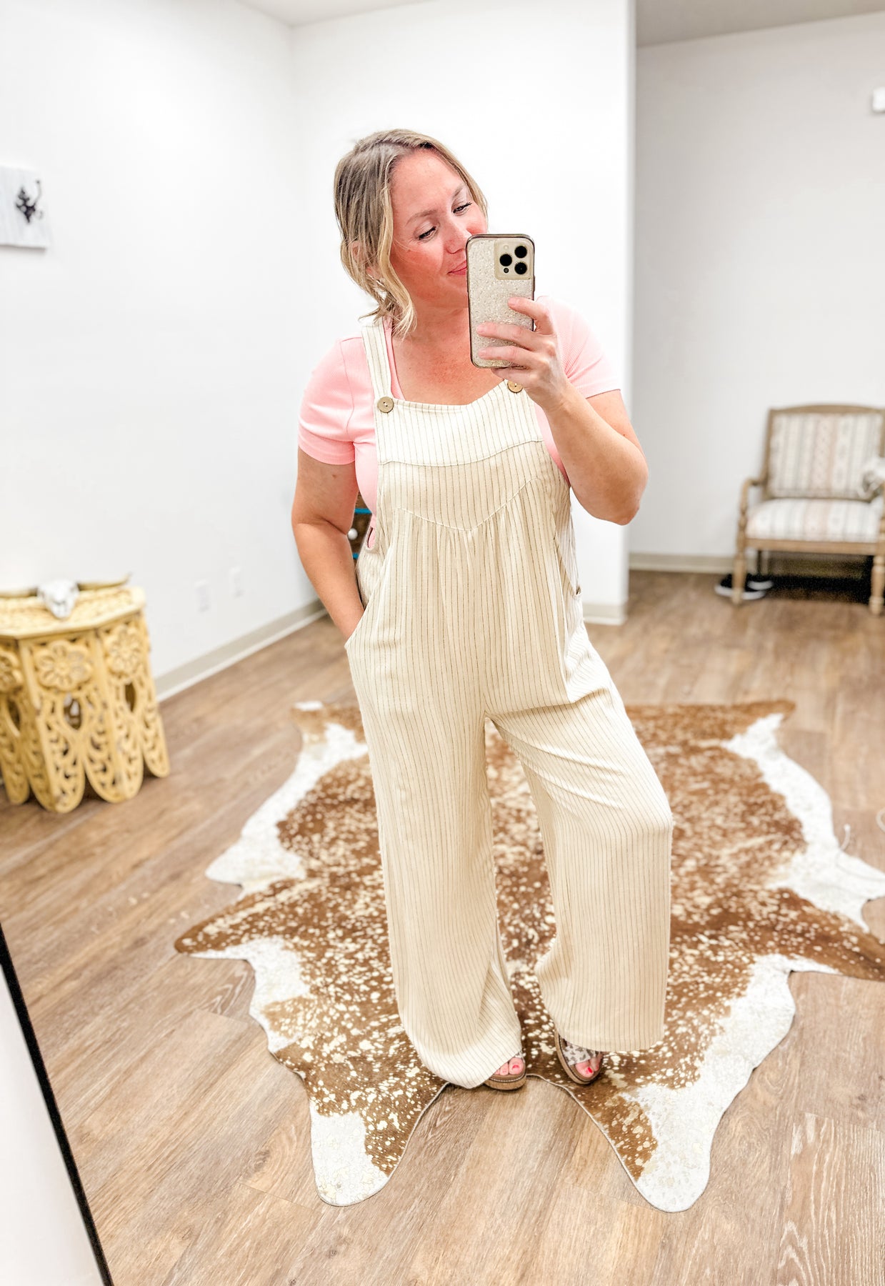 Oh my, guys these overalls are SO COMFORTABLE AND CUTE! I am in love. This pair will be your go-to for an easy, cute look with zero effort. Made from a light linen blend, she's got slim vertical stripes - of course super flattering - roomy wide legs, and adjustable button straps for a perfect fit.  With fun, functional side pockets and a relaxed shape, she keeps you comfortably all day.