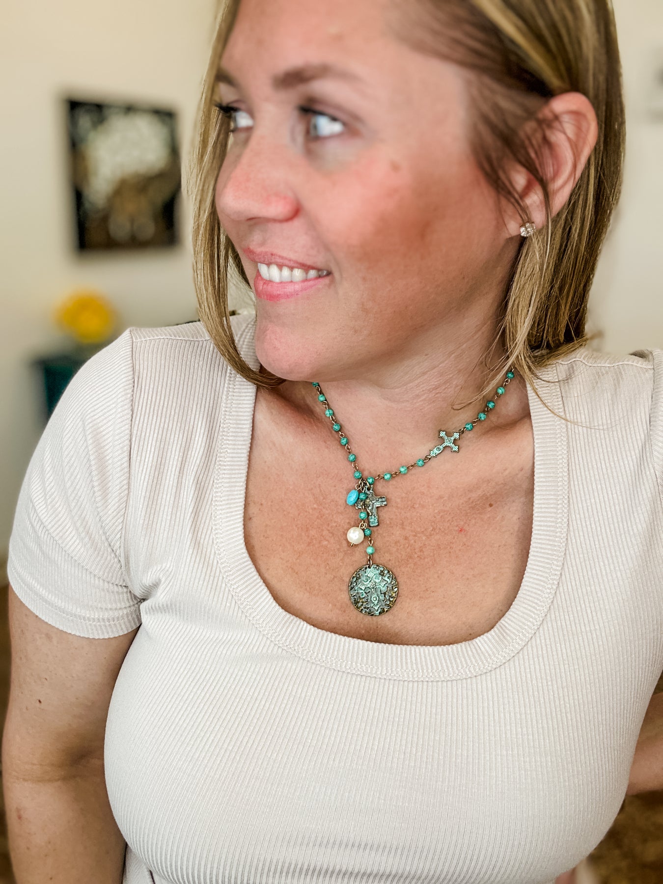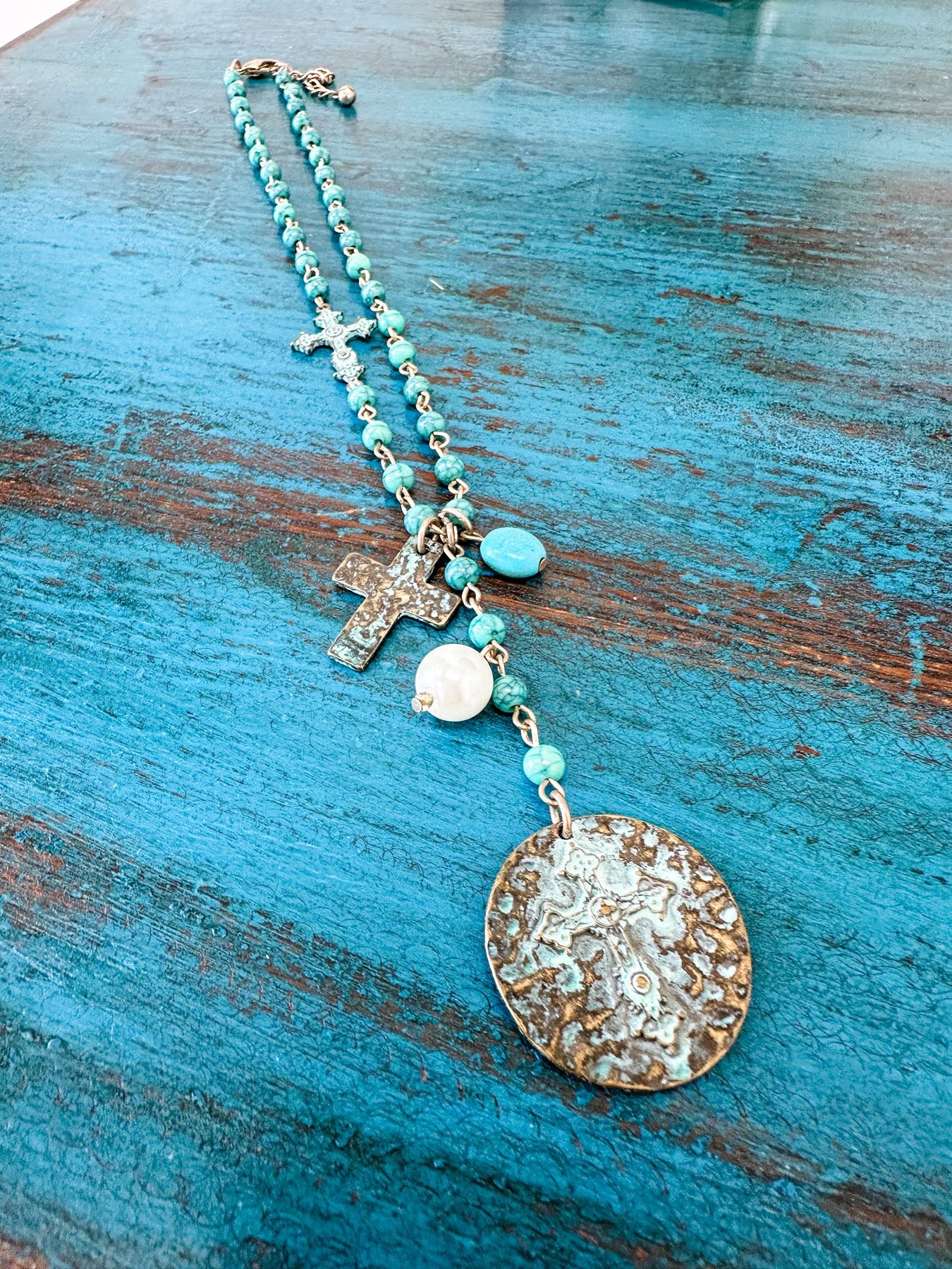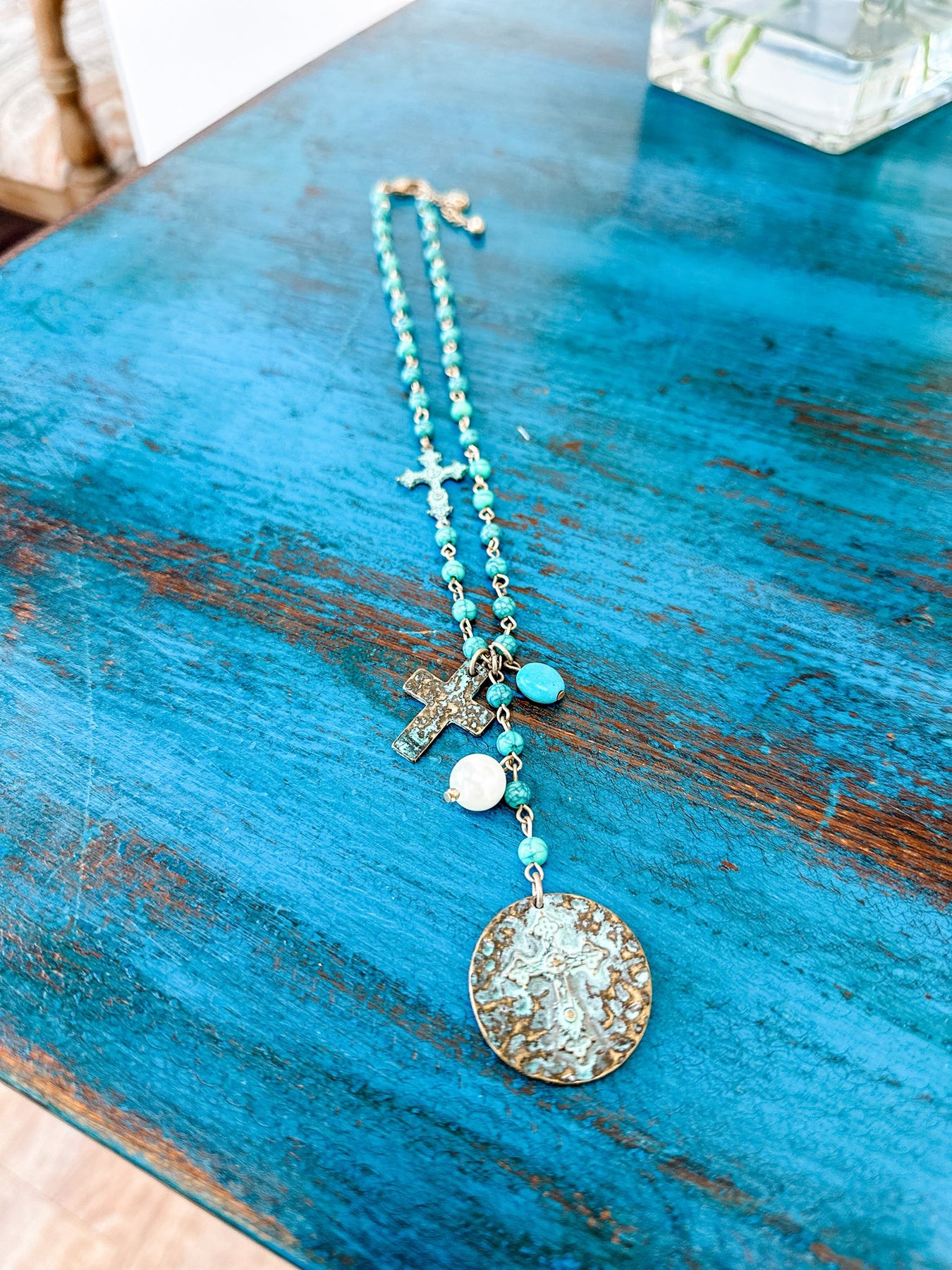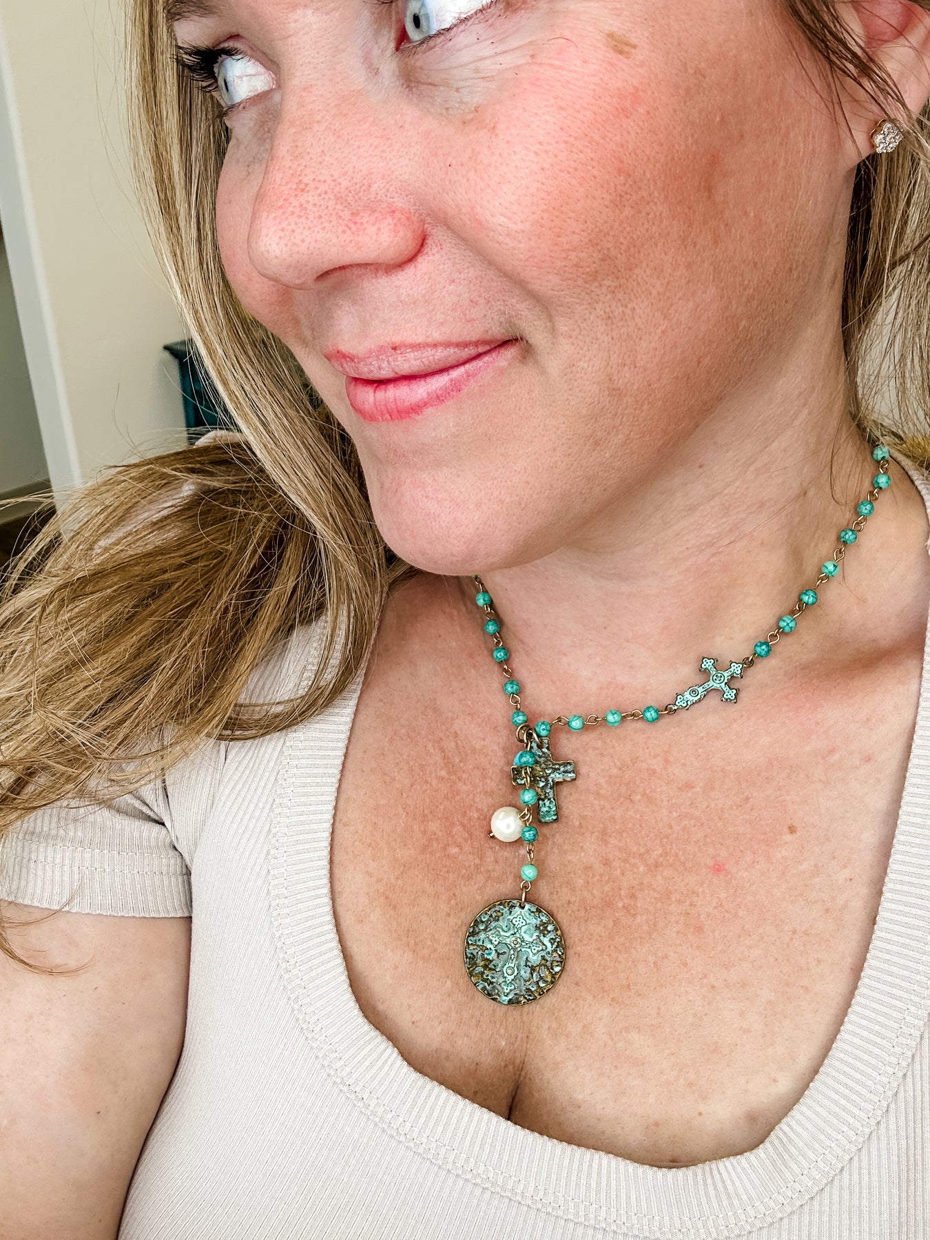 Redeem – Turquoise Patina Beaded Cross Charm Necklace