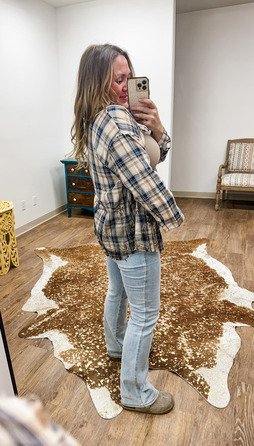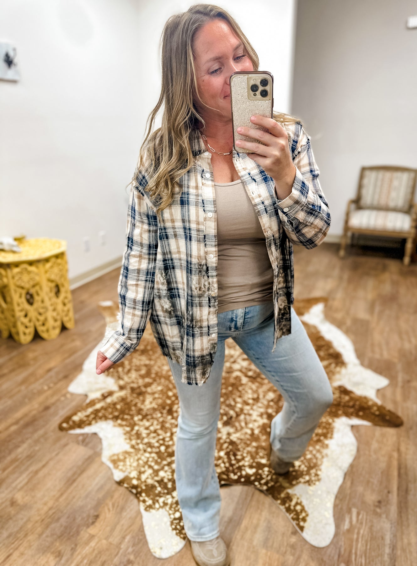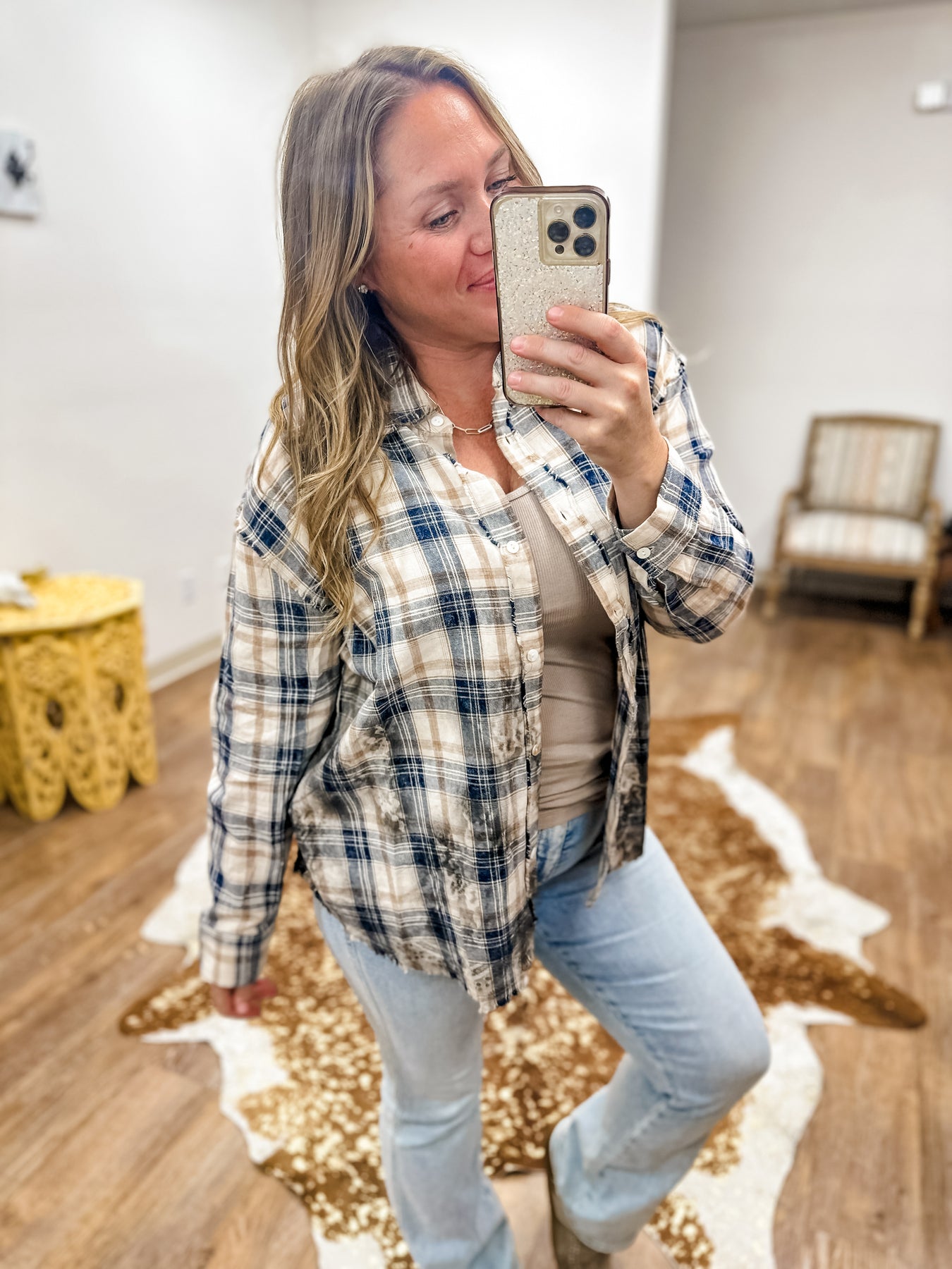 Presley is that perfect mix of rugged and romantic. This lightweight plaid button-up has a lived-in feel with soft navy and tan tones, raw edges, and a spray-dyed lace design that gives her that one-of-a-kind look. The faded print detail along the hem and back is like something you'd stumble across in a vintage shop—unexpected and totally charming.