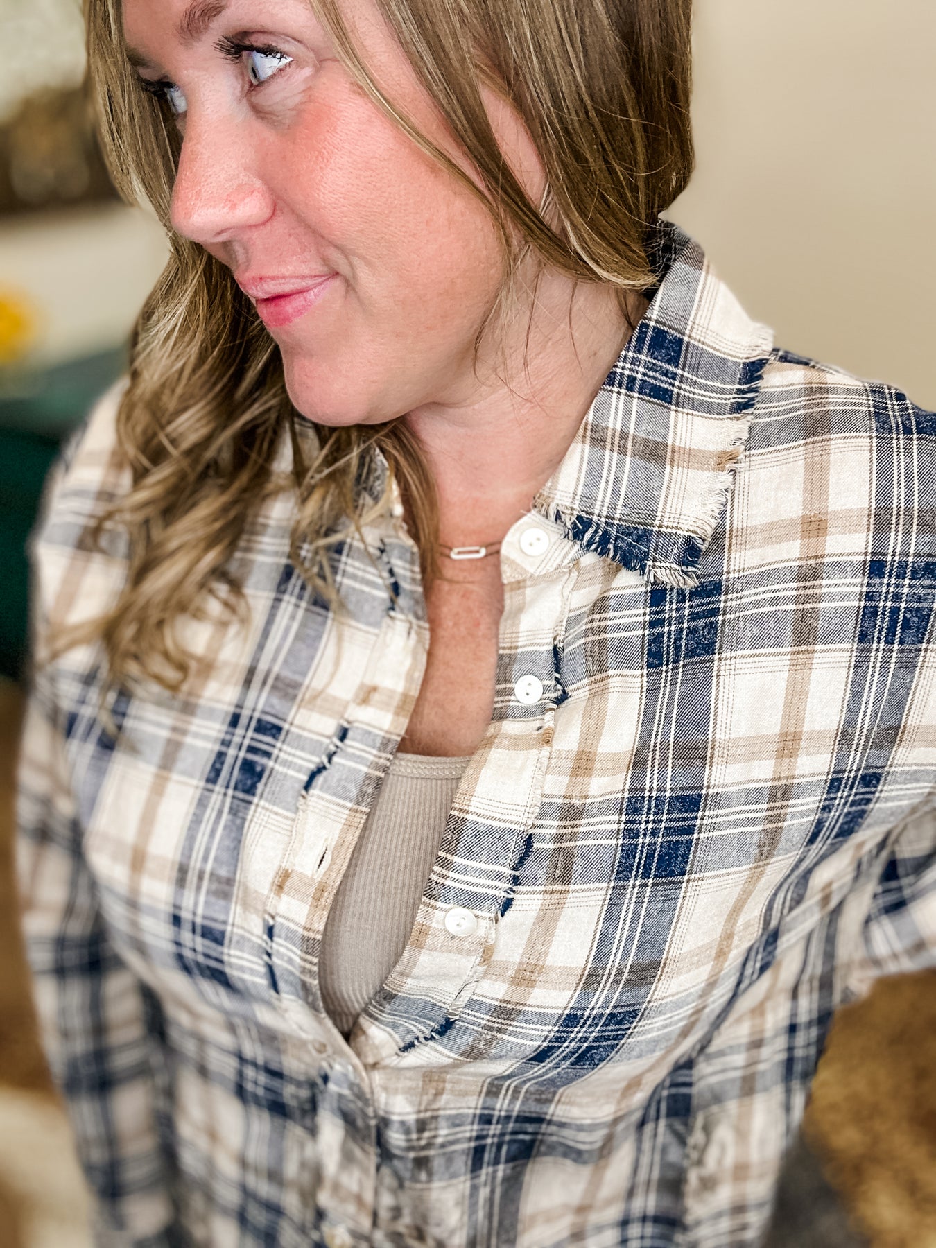 Presley – Navy & Taupe Plaid Button-Up with Lace-Effect Hem