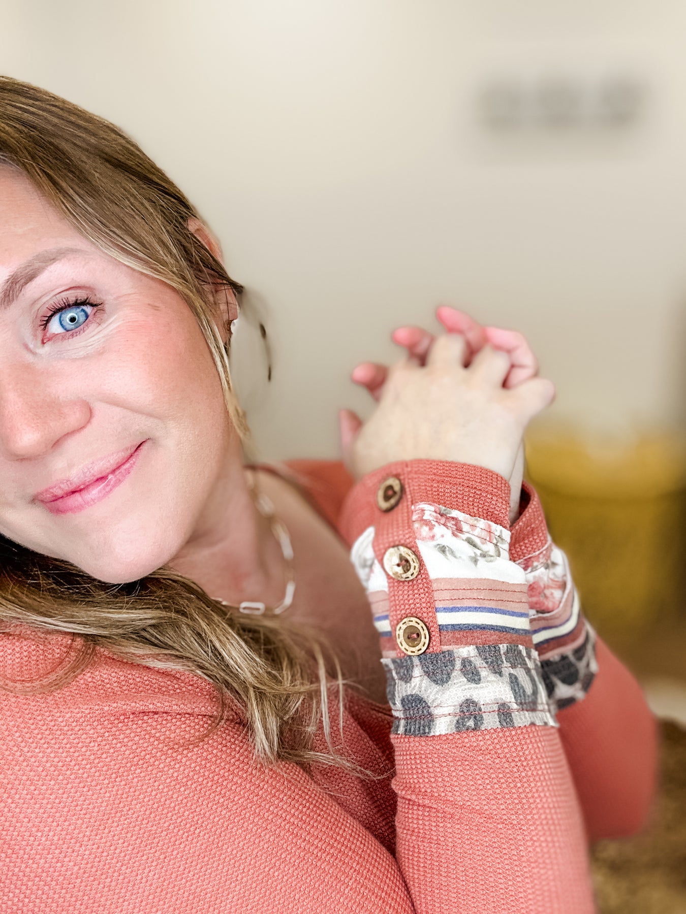 The longer length is great with leggings or jeans, and the scoop neckline lays really nicely without feeling too low. And that little pop of leopard + print at the sleeves? Just enough personality to make the outfit feel styled without you having to try. It’s the perfect everyday “feel cute, stay comfy” top.