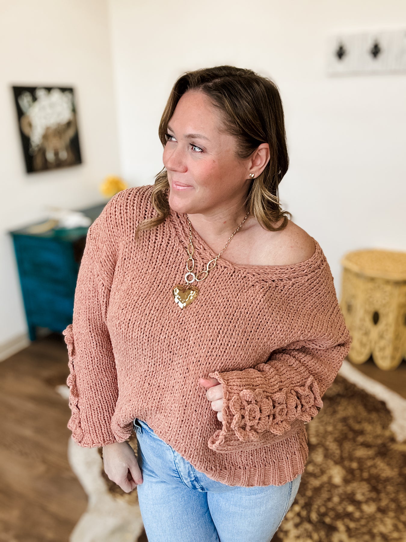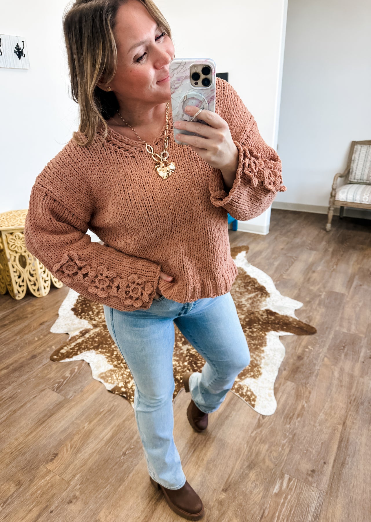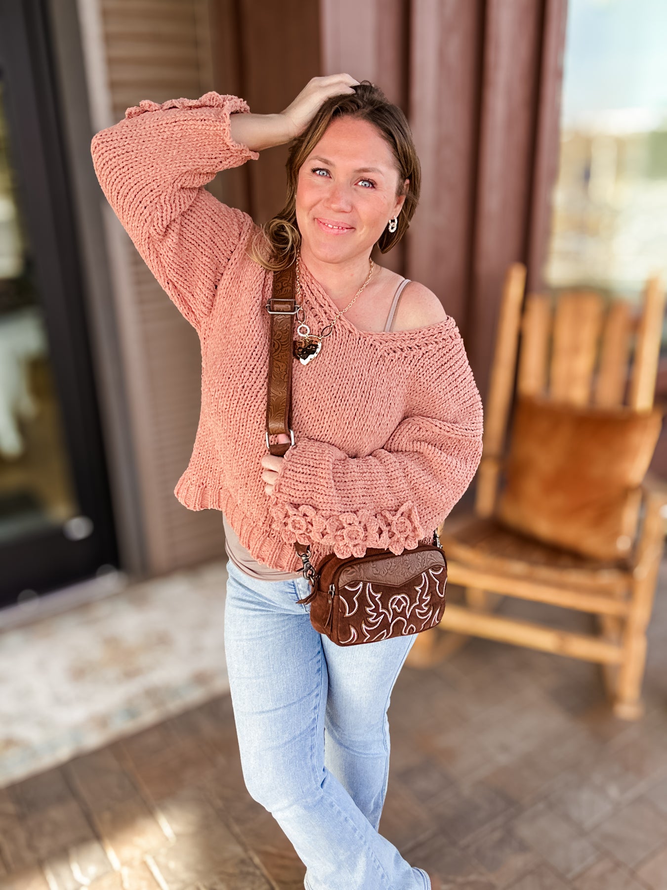 This sweater is doing emotional support work.  It’s wildly soft, sooo cozy, and clearly designed to make you feel more lovable than usual.  The crochet flowers say sweet, the chunky knit says stay home, and together they’re adorable.  Perfect for Valentine’s Day, spring days, and any moment you need a little softness.... everyday really!
