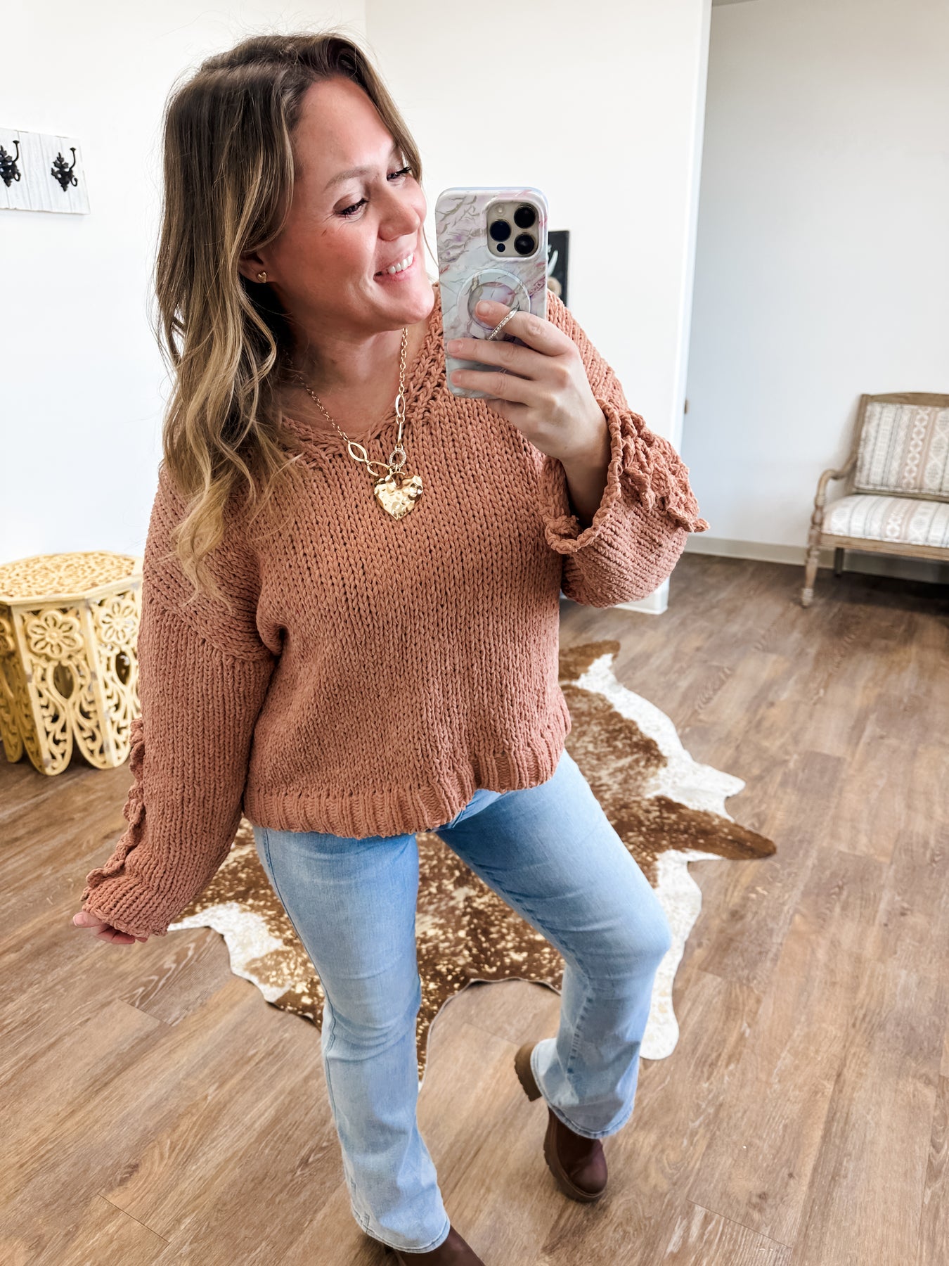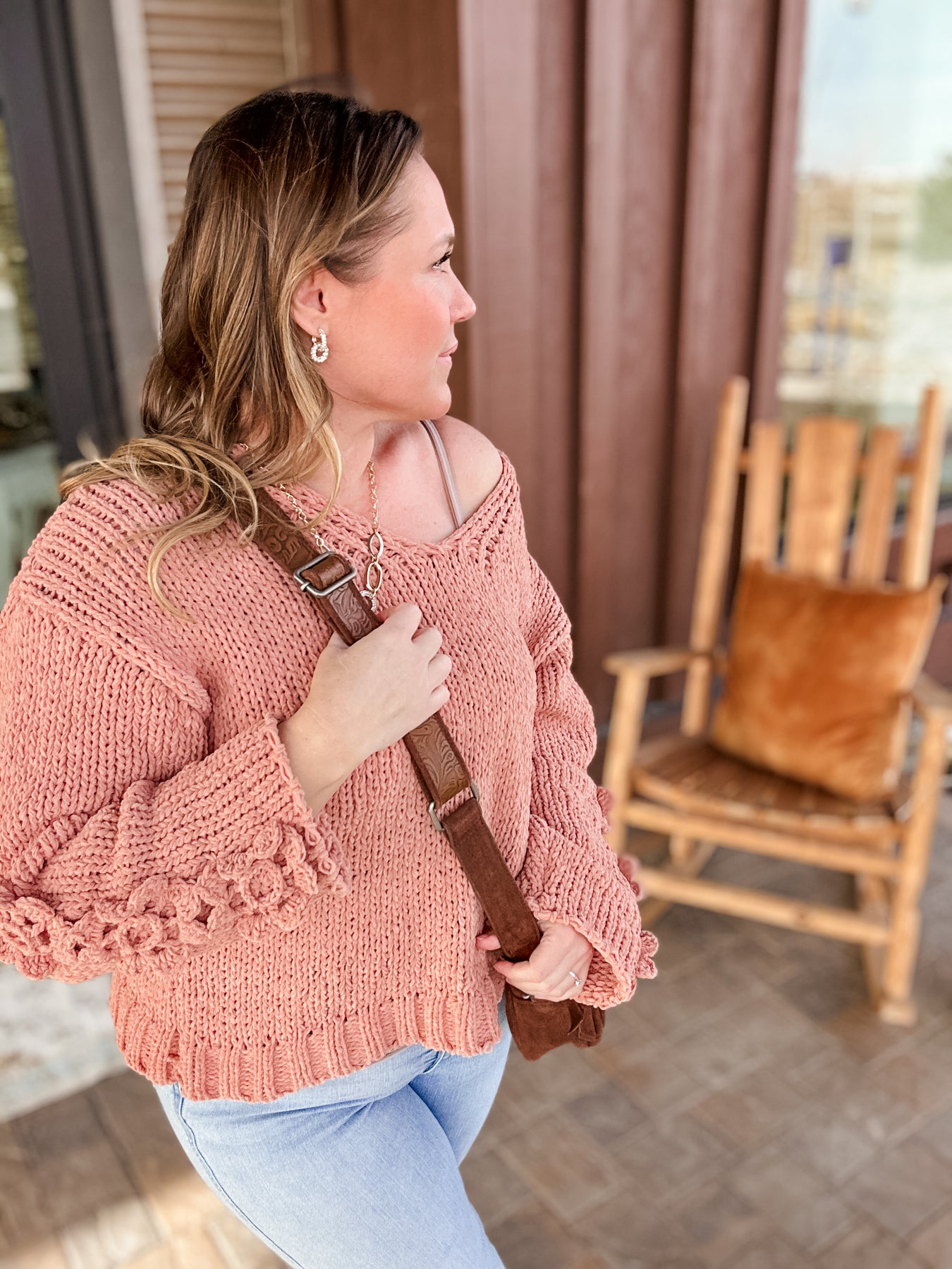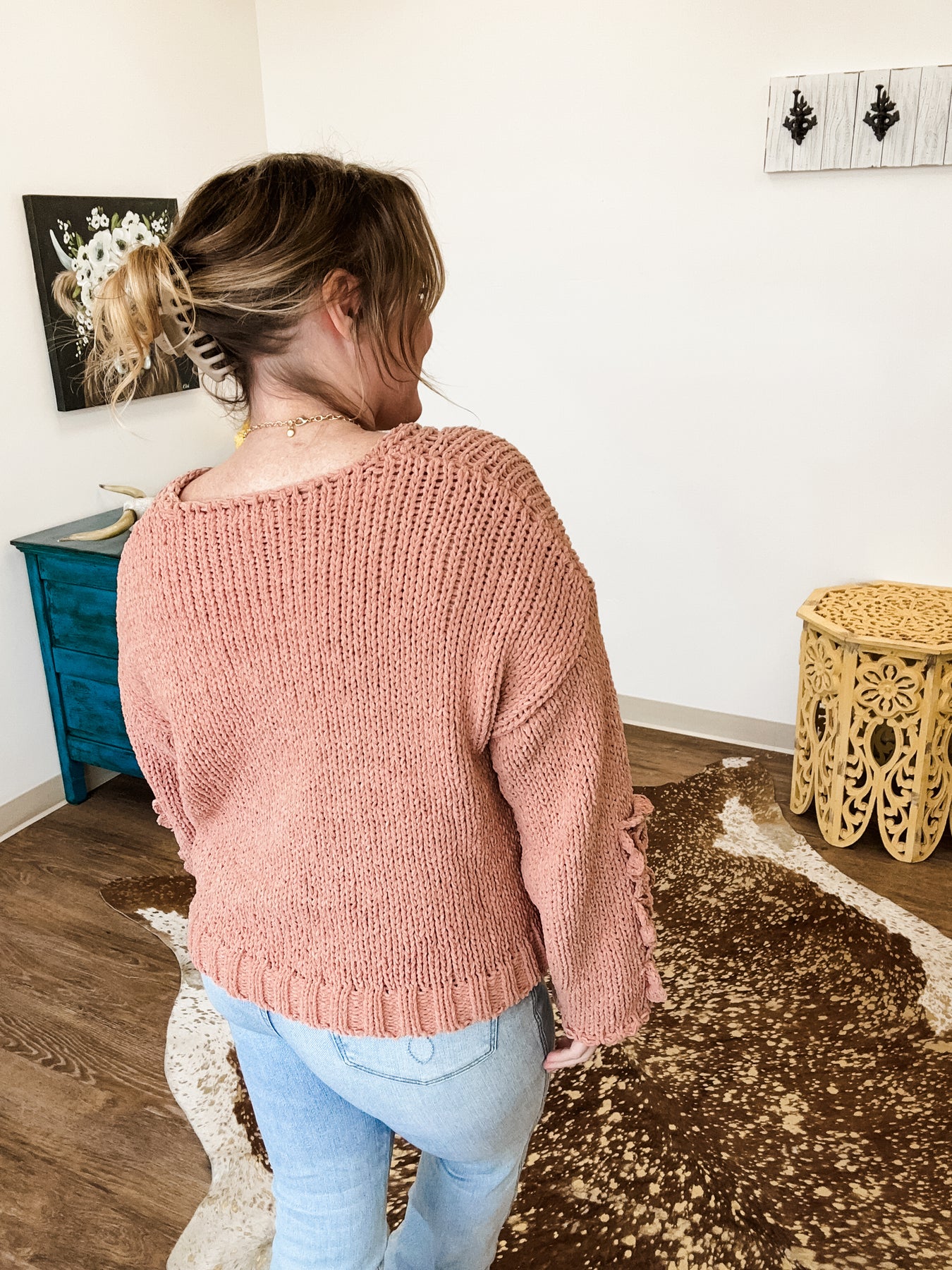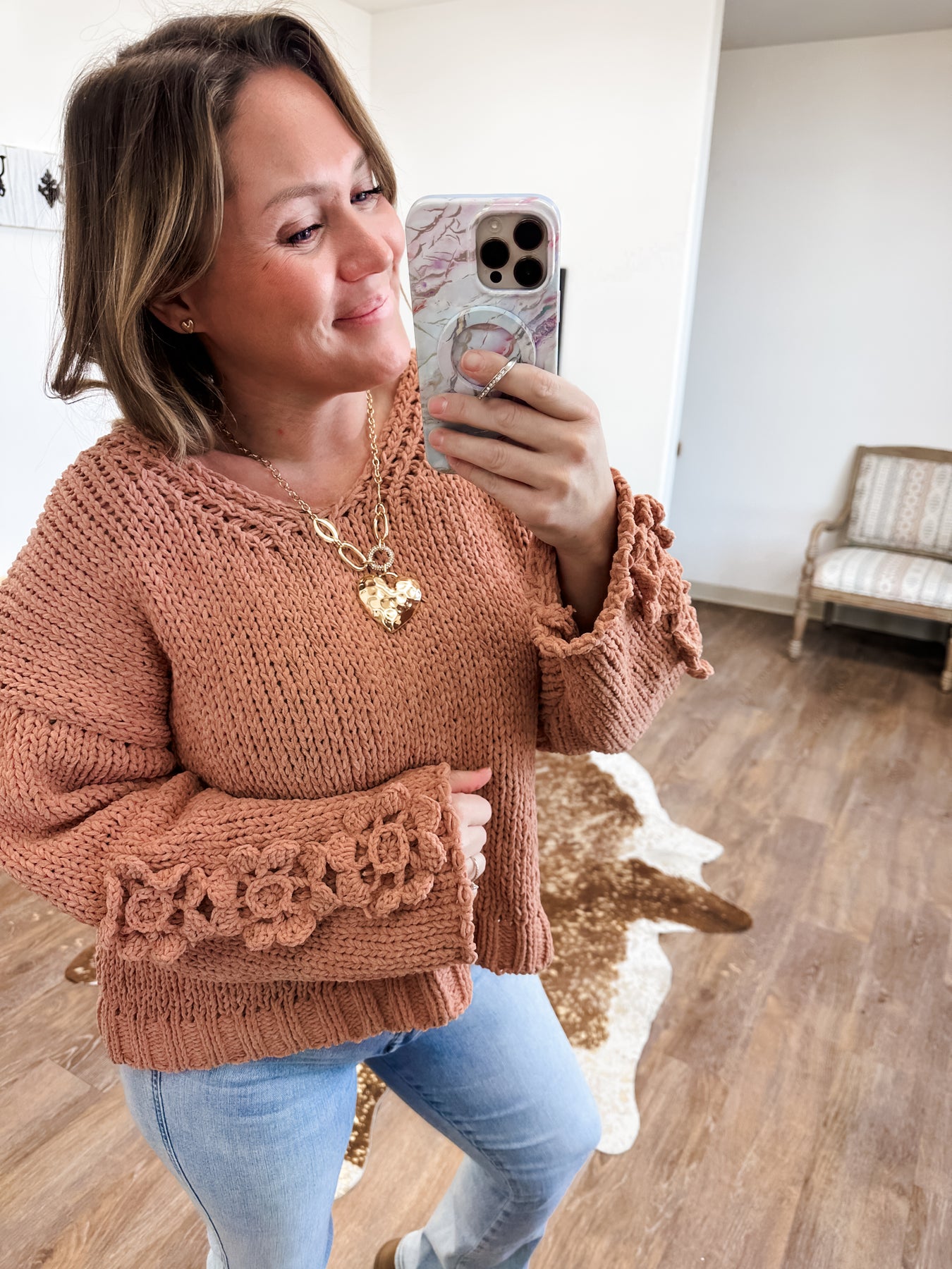 This sweater is doing emotional support work.  It’s wildly soft, sooo cozy, and clearly designed to make you feel more lovable than usual.  The crochet flowers say sweet, the chunky knit says stay home, and together they’re adorable.  Perfect for Valentine’s Day, spring days, and any moment you need a little softness.... everyday really!
