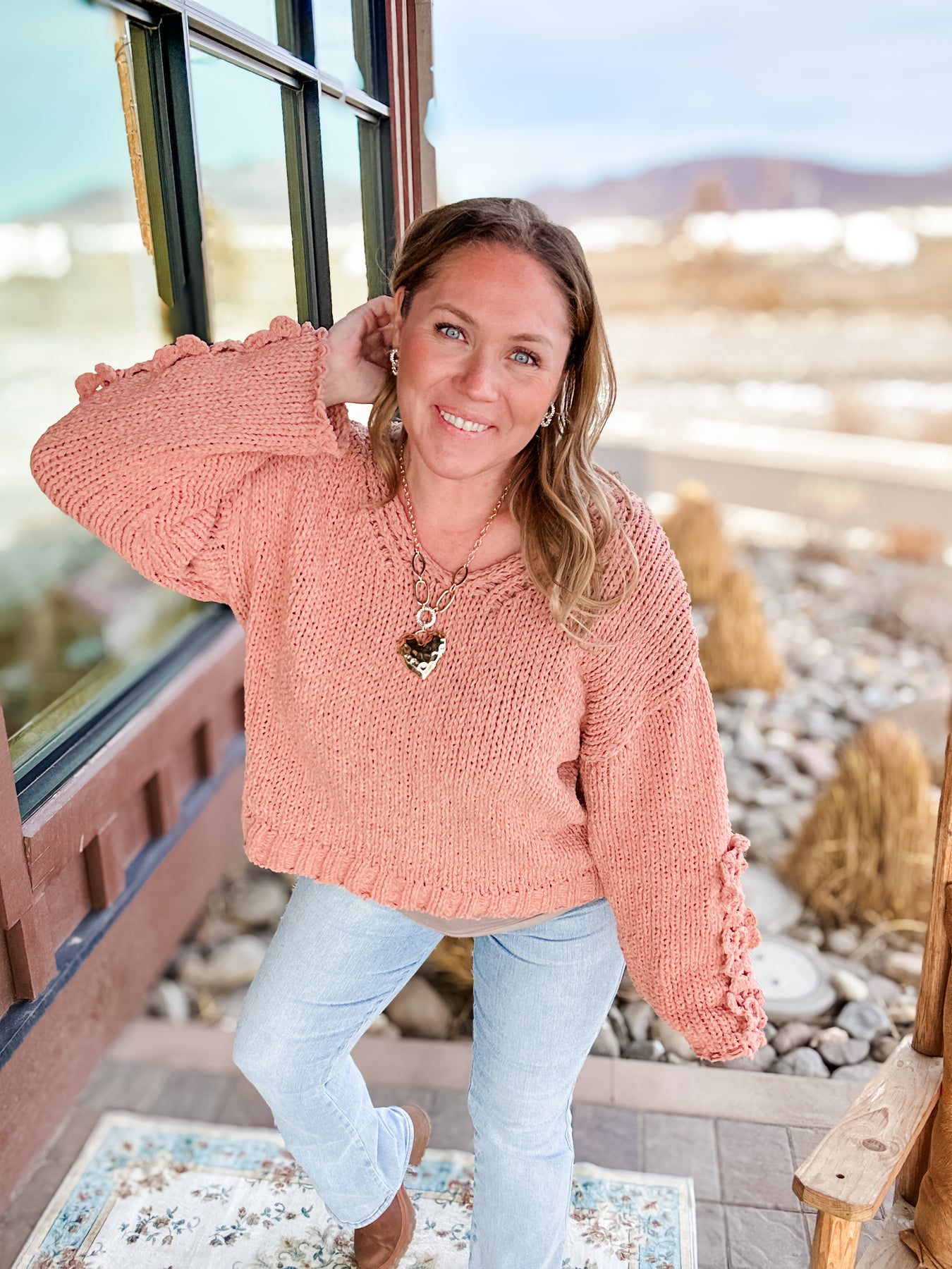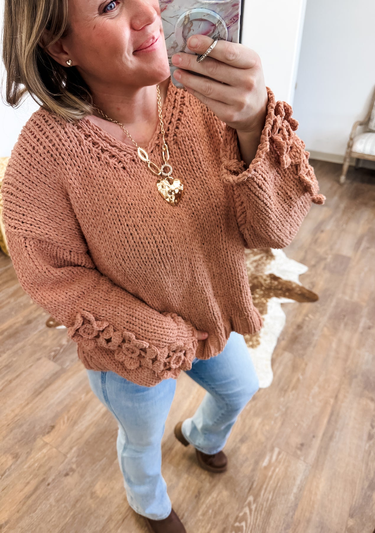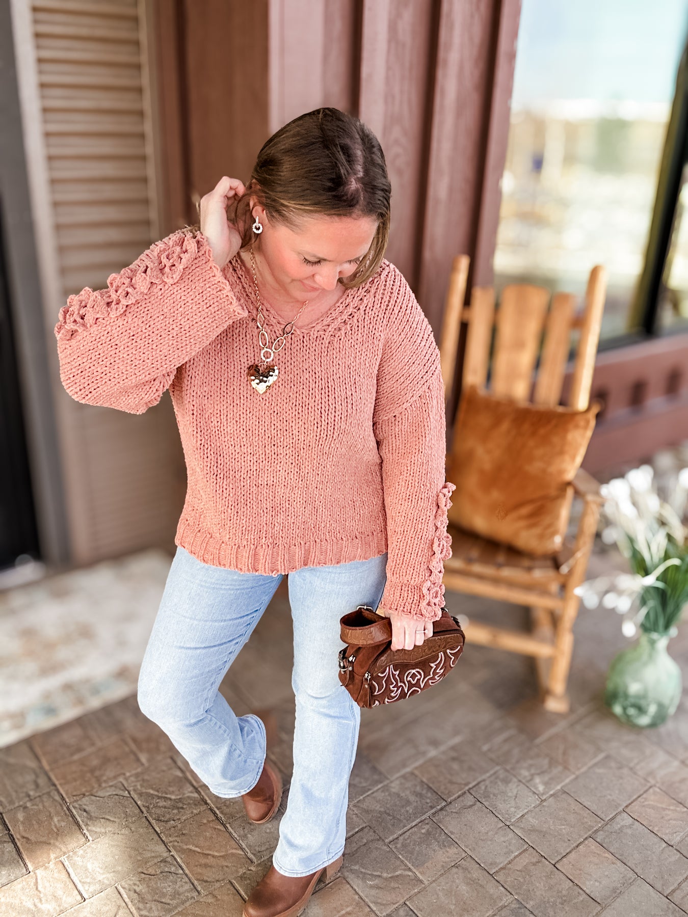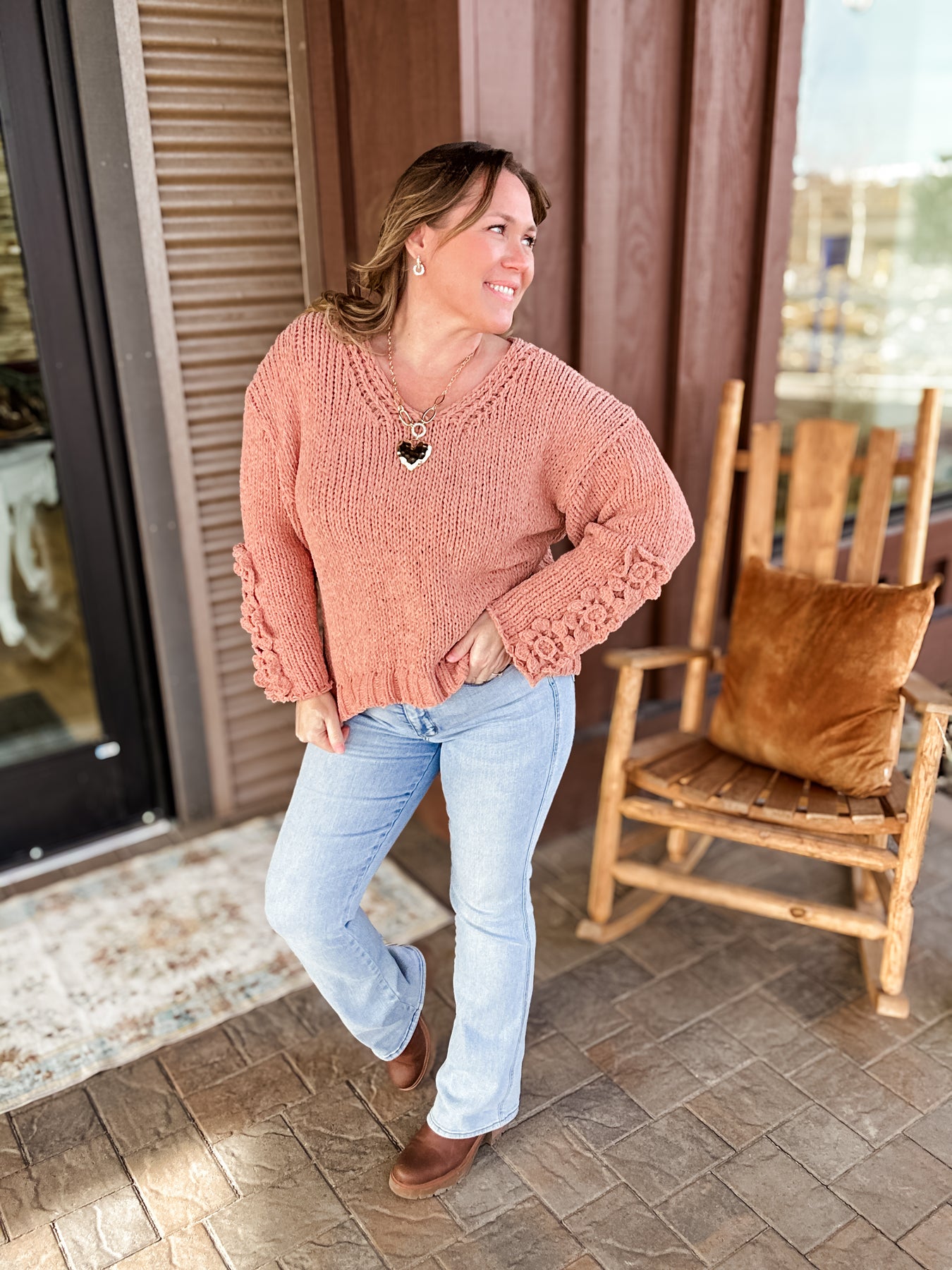 Sophie - Dusty Peach Chunky Knit Vneck Sweater with Crochet Applique Flower Sleeve Detail
