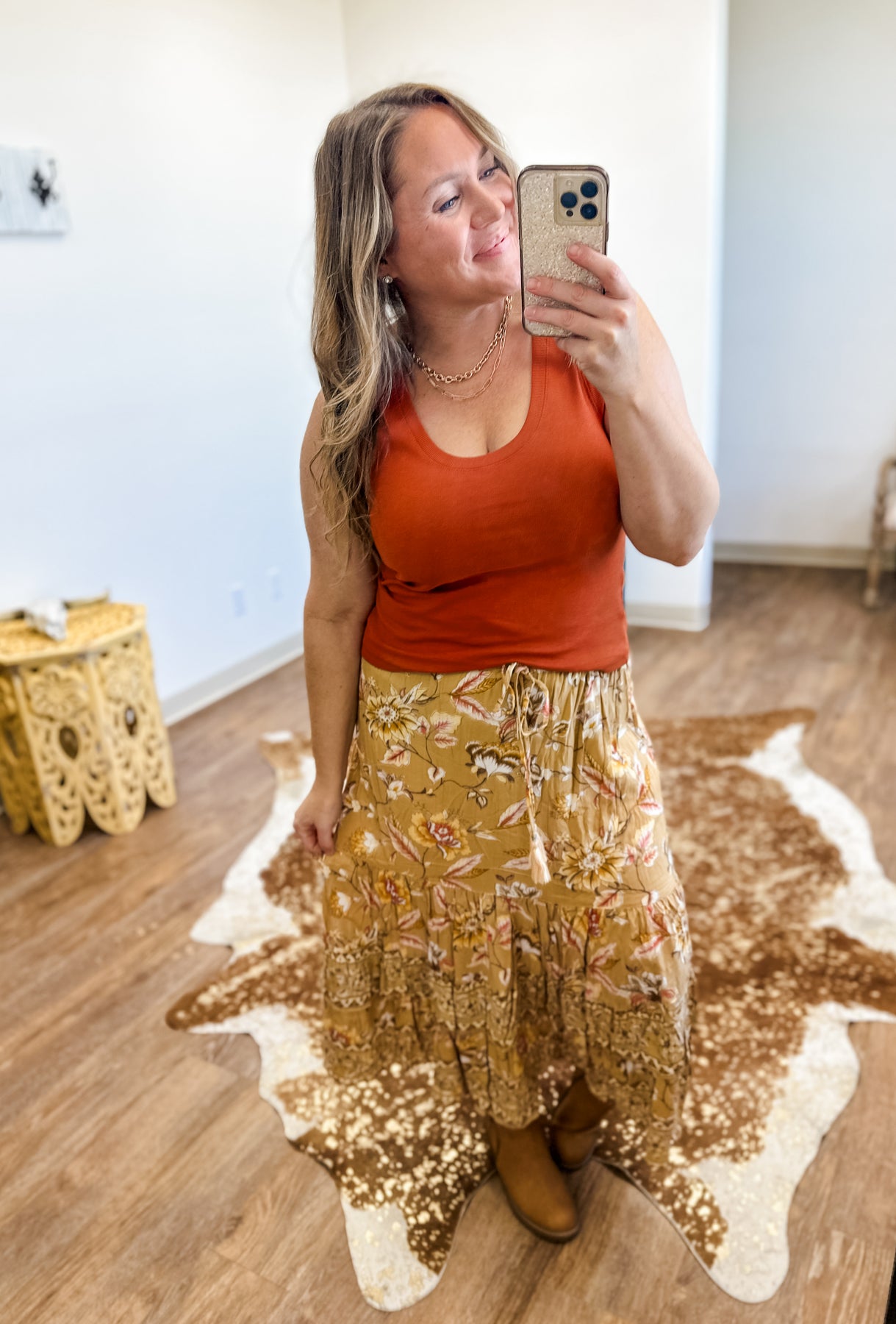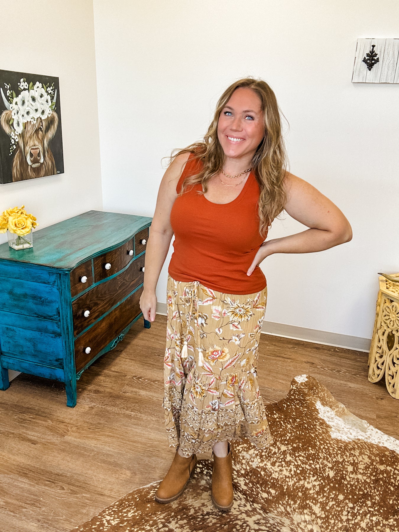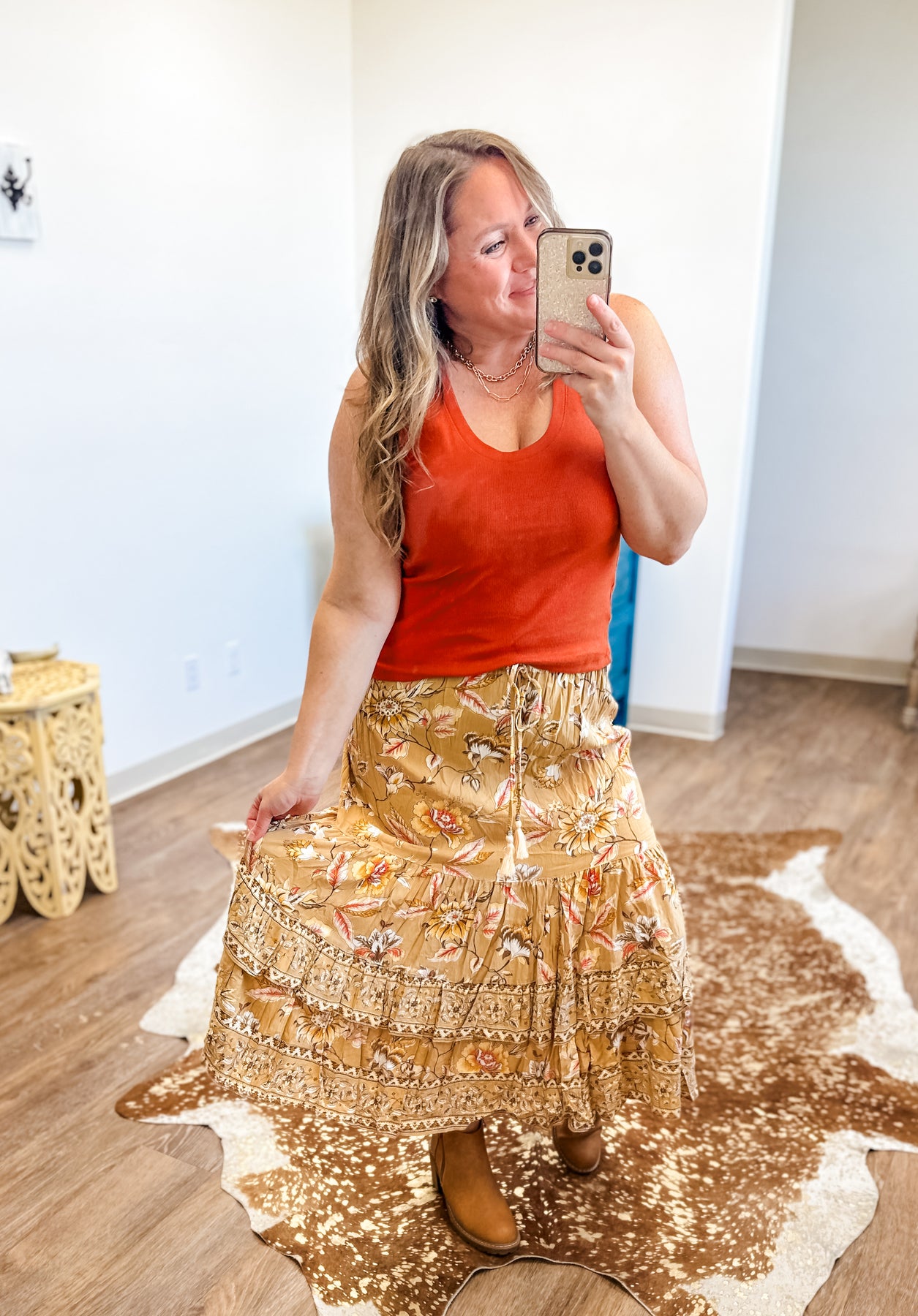 Okay girl, June is pure sunshine in a skirt. She’s got that golden, floral print that makes you want to pack up and head straight for a weekend road trip.  Windows down, your favorite song playing, and this flowy beauty catching the breeze. The tiered silhouette gives her that romantic, twirl-worthy movement, and the soft boho print keeps her feeling timeless and easy.