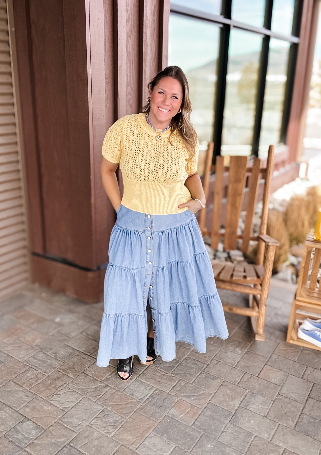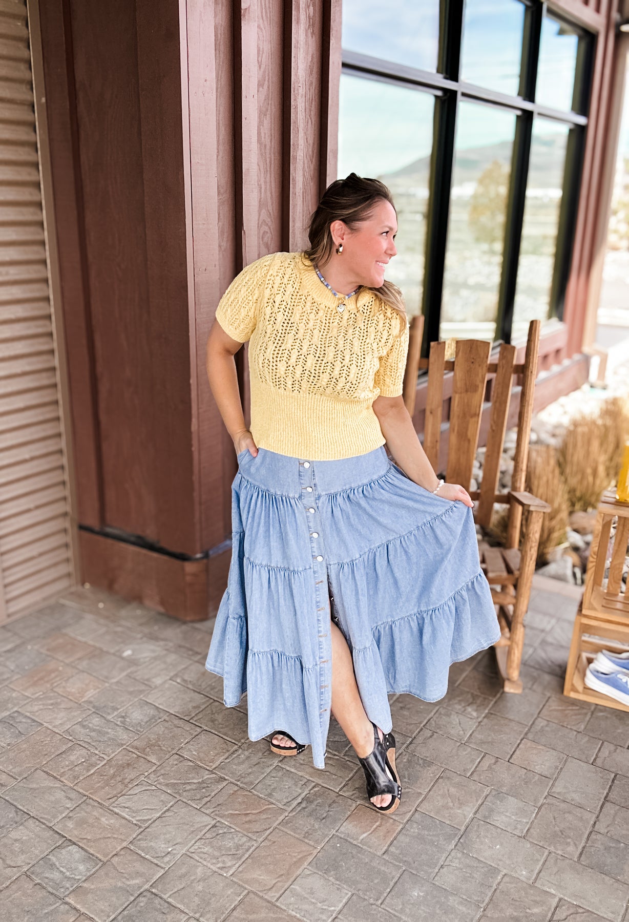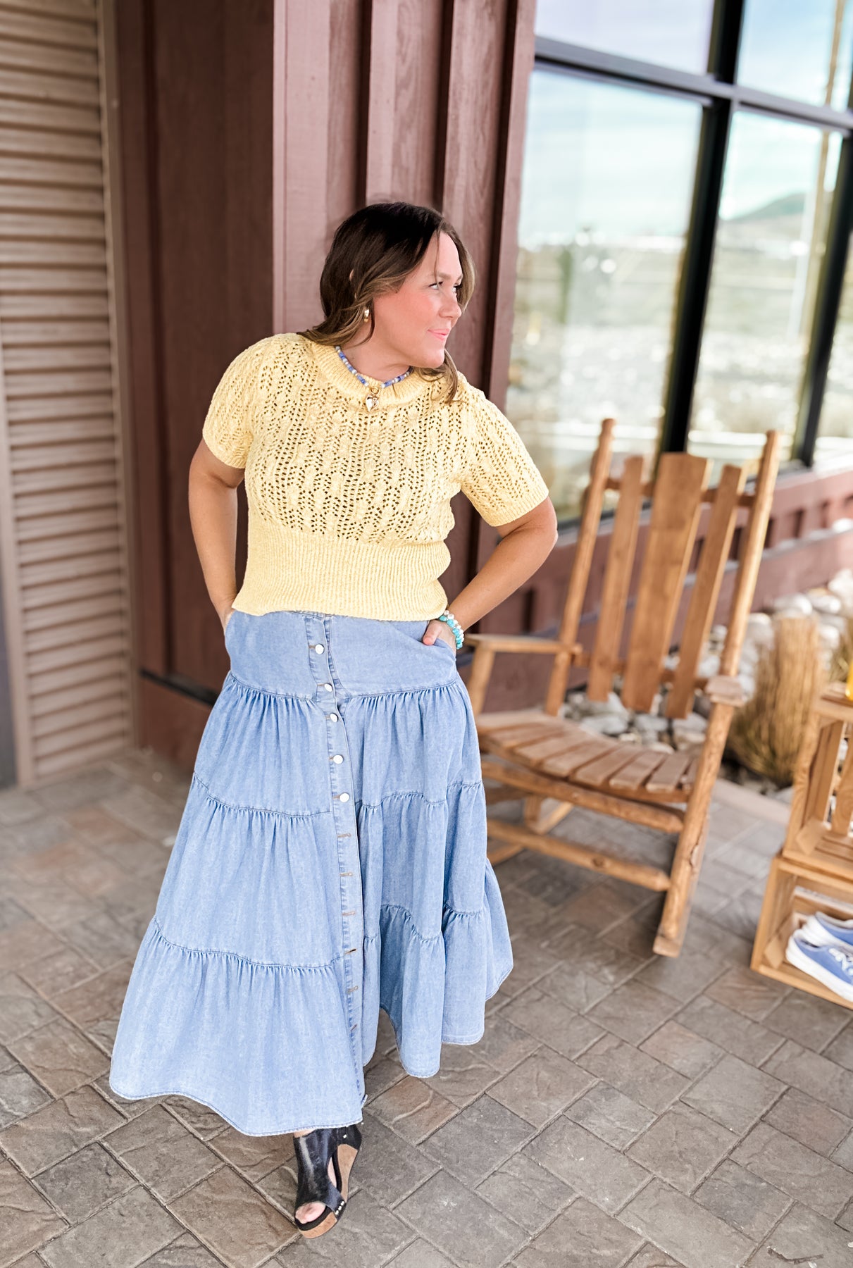 Bluebelle - Tiered Button Front Denim Maxi Skirt with Pockets