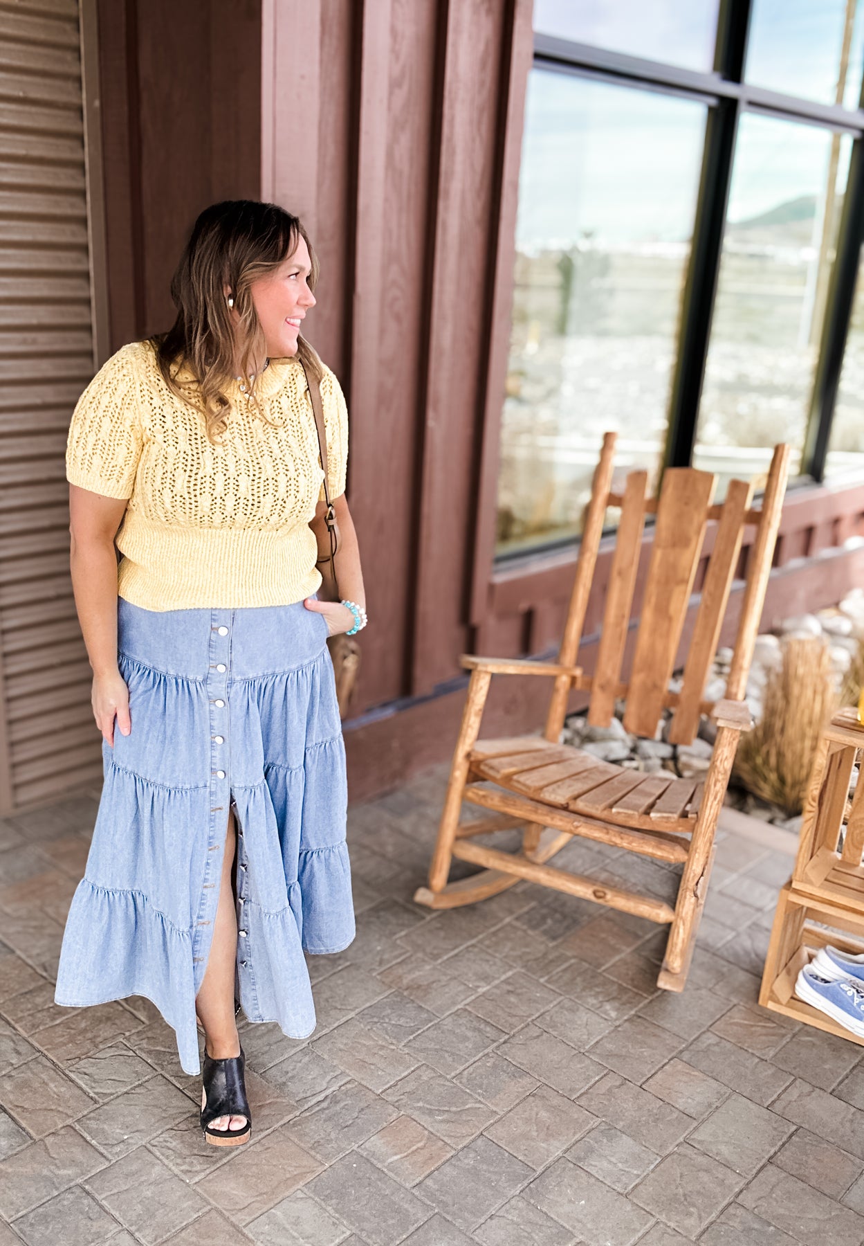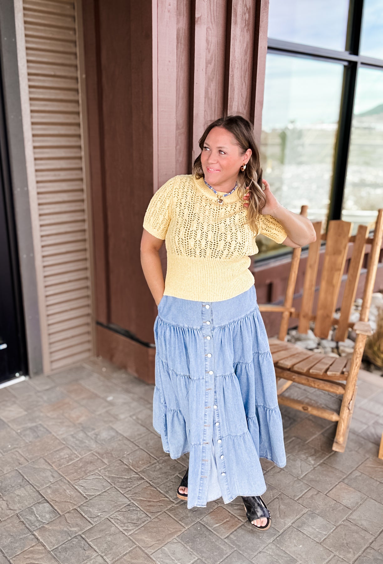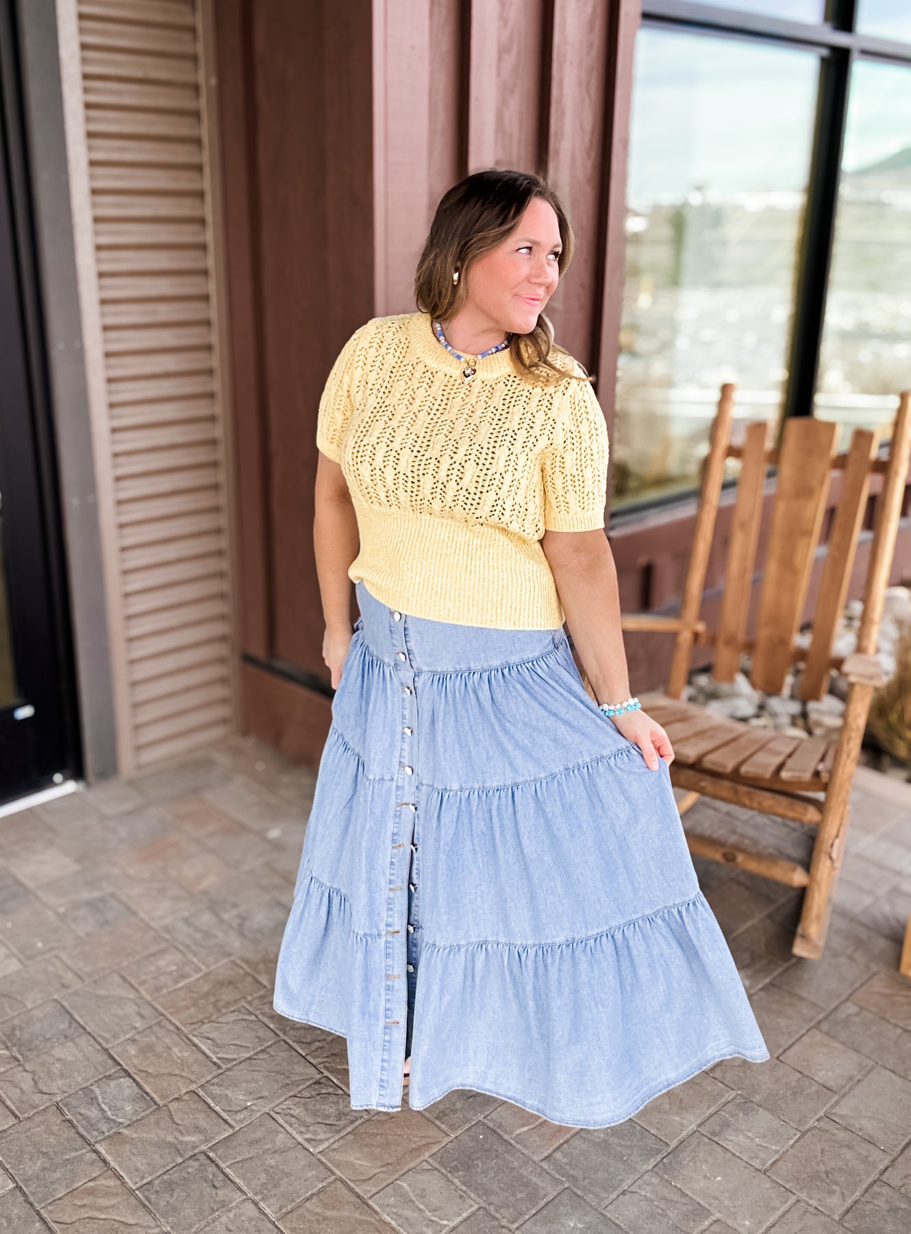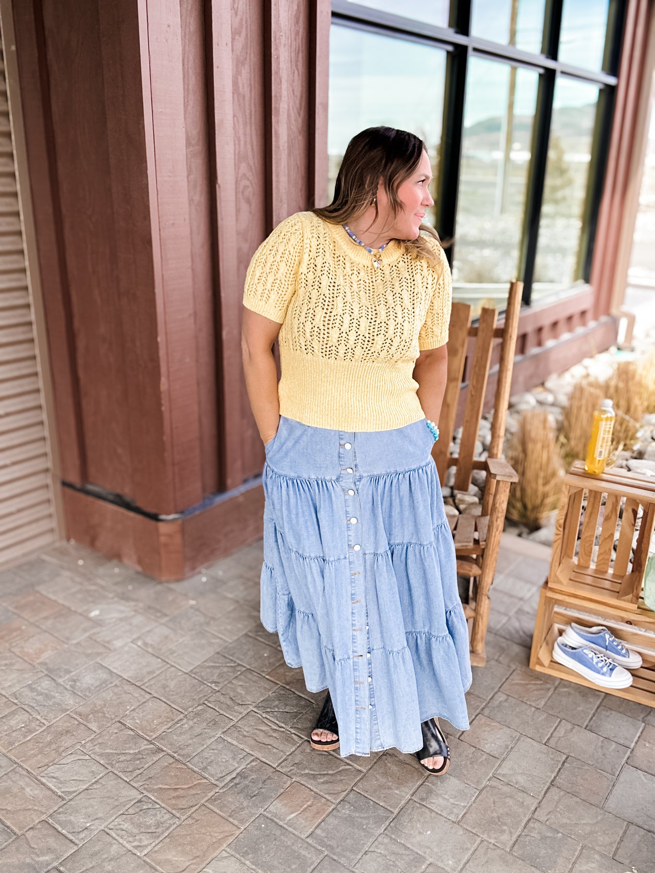 Bluebelle - Tiered Button Front Denim Maxi Skirt with Pockets