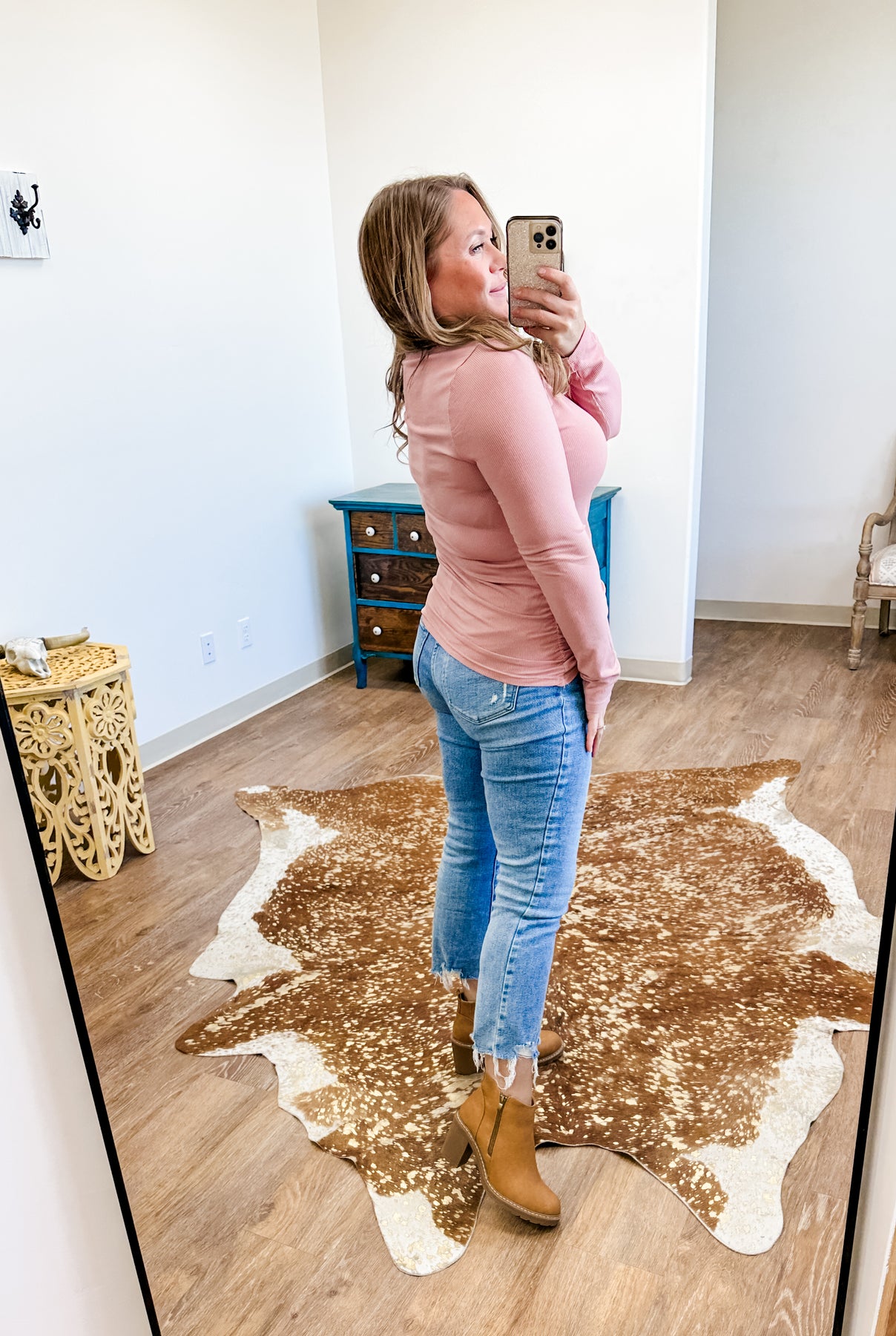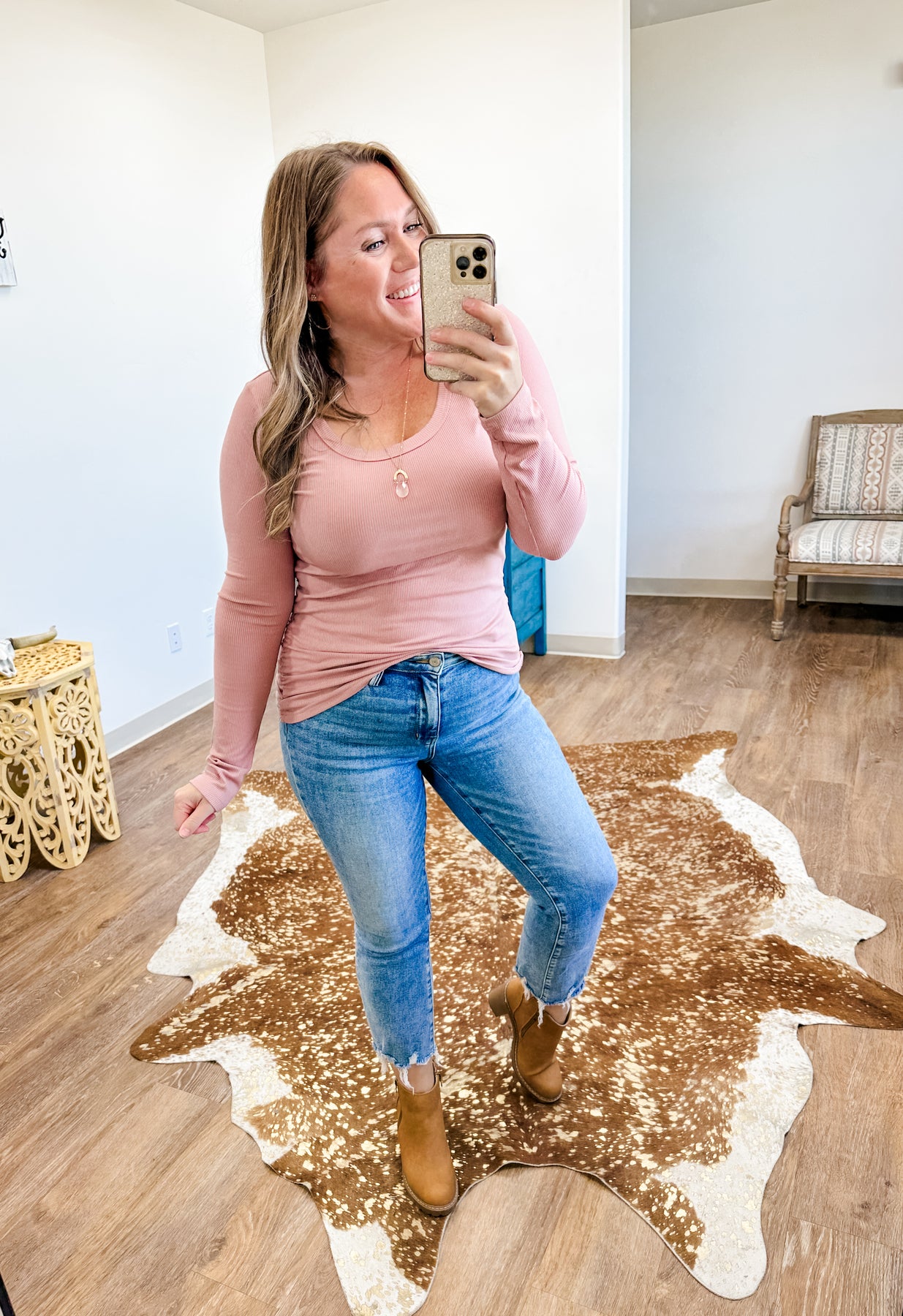 Brynnlee (BEST SELLER NEW COLOR) - Mauve Pink Ribbed Scoop Neck Long Sleeve Top with Side Ruching