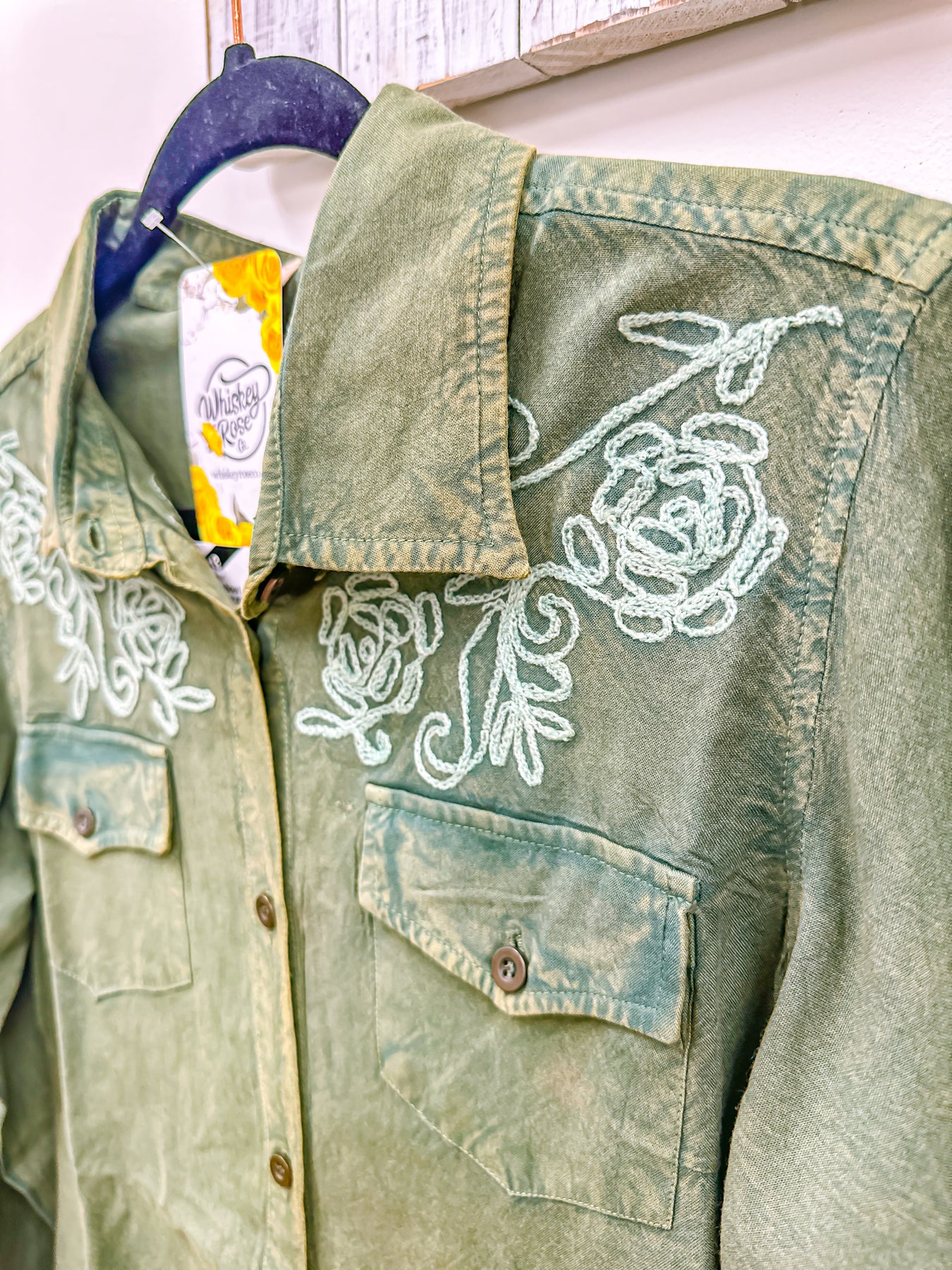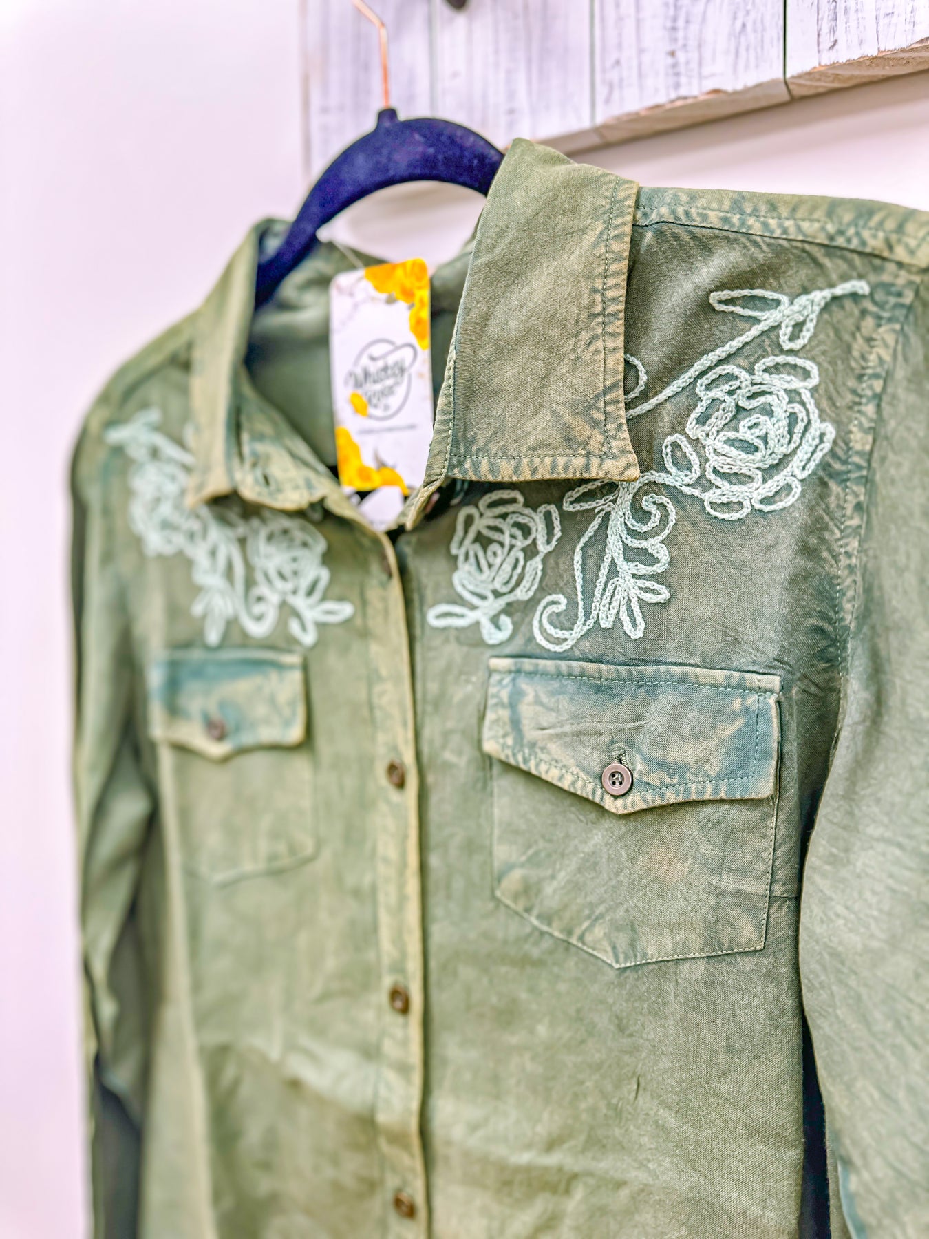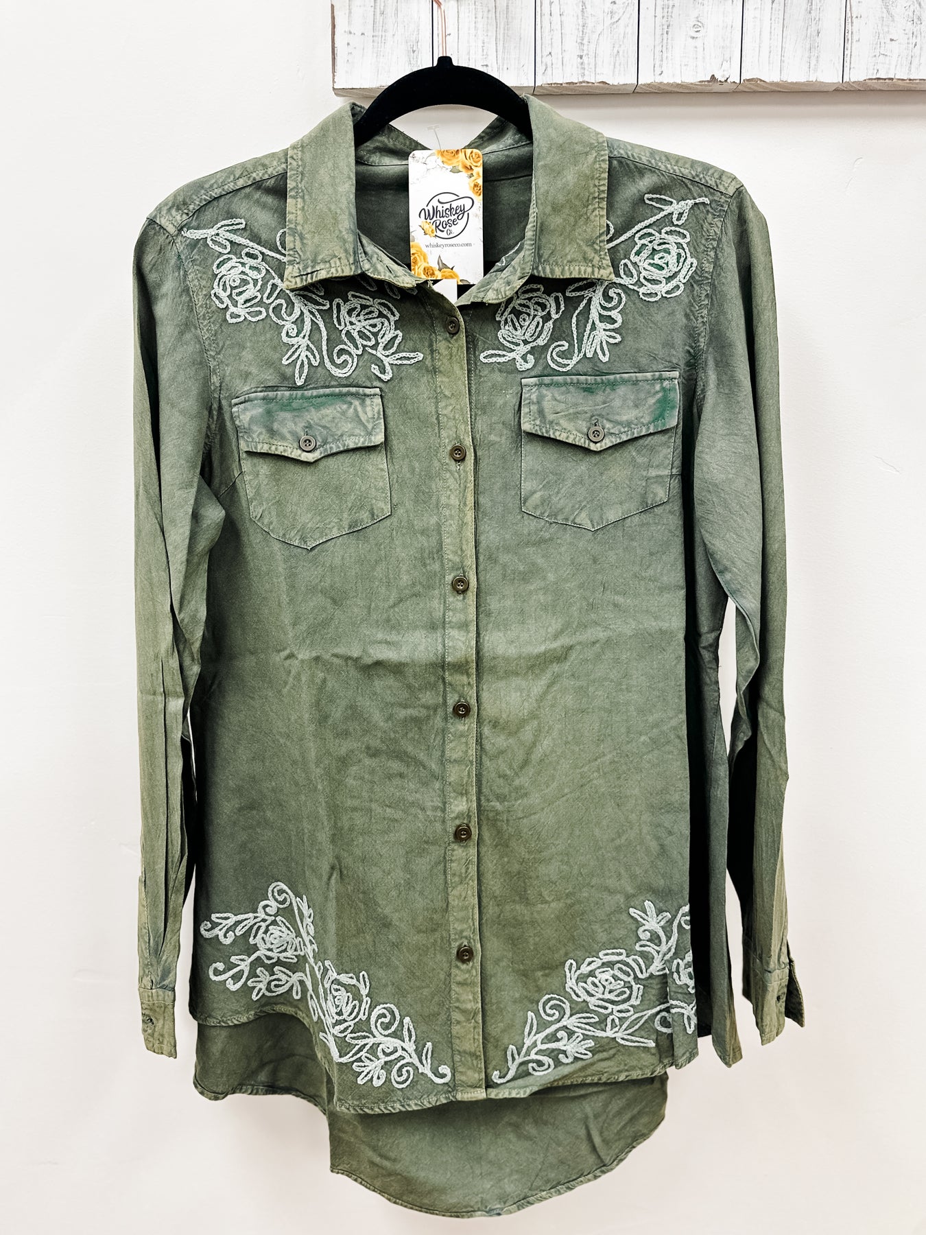 Lola - Olive Embroidered Button Front Hi-Low Hem Top