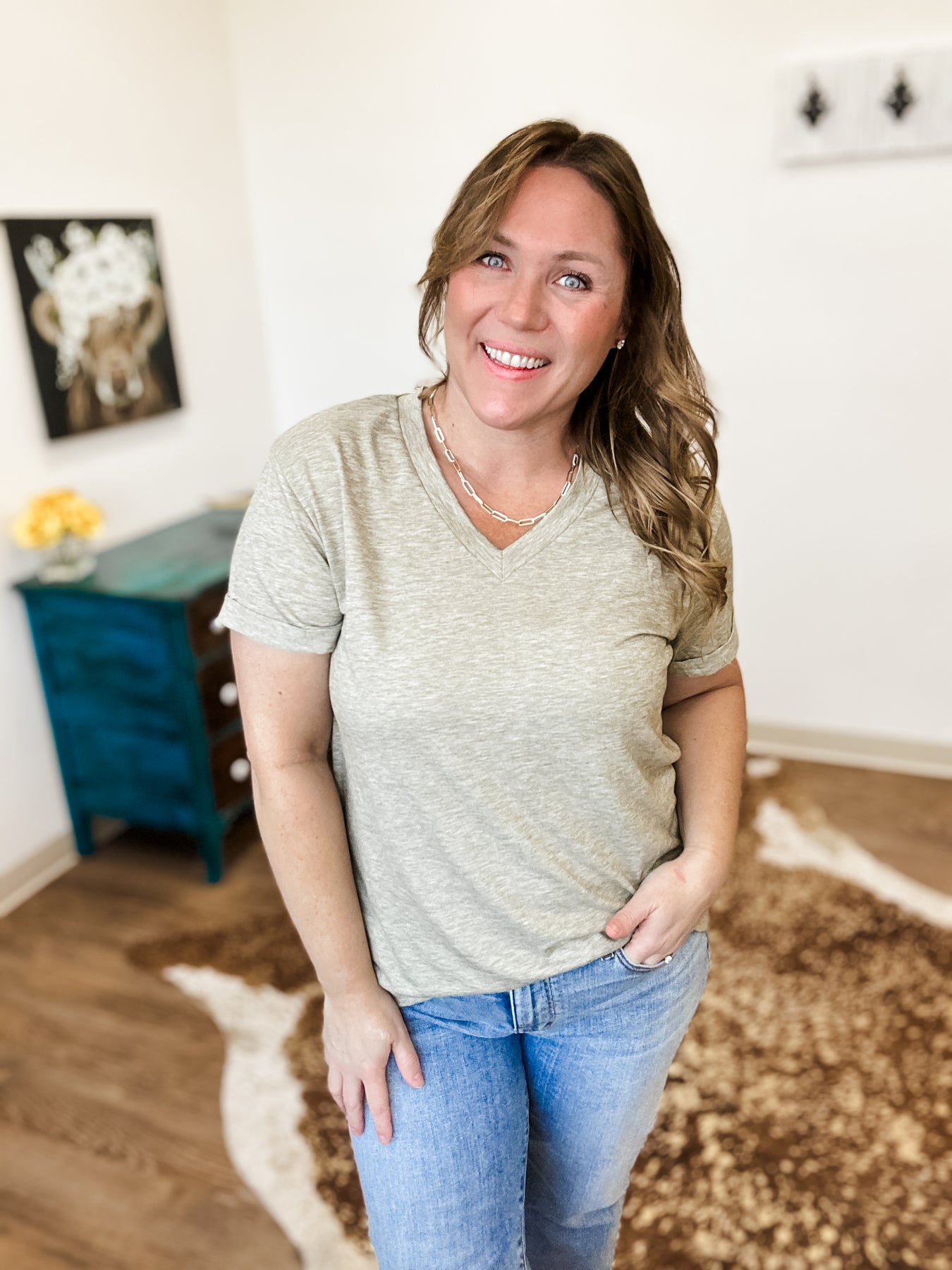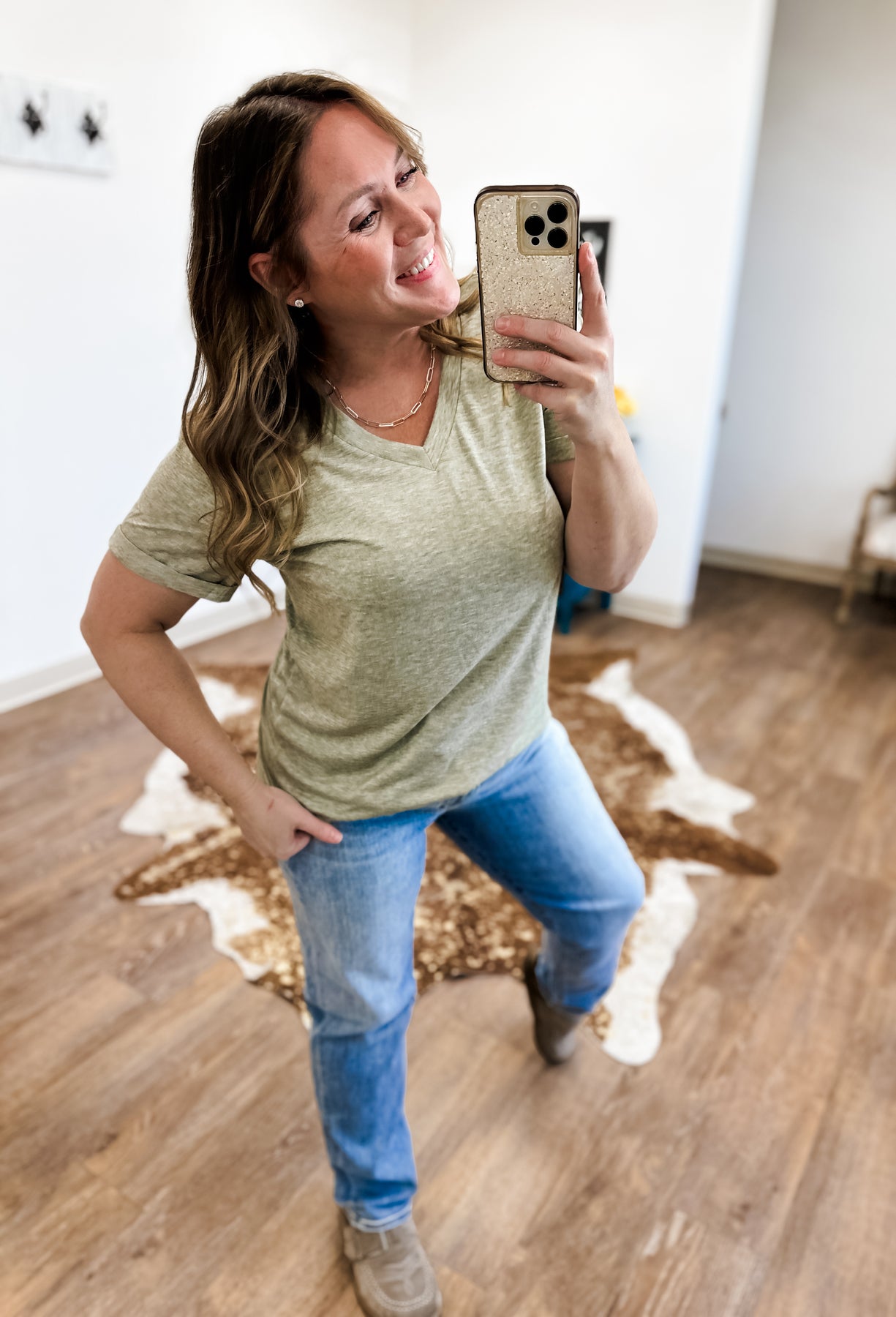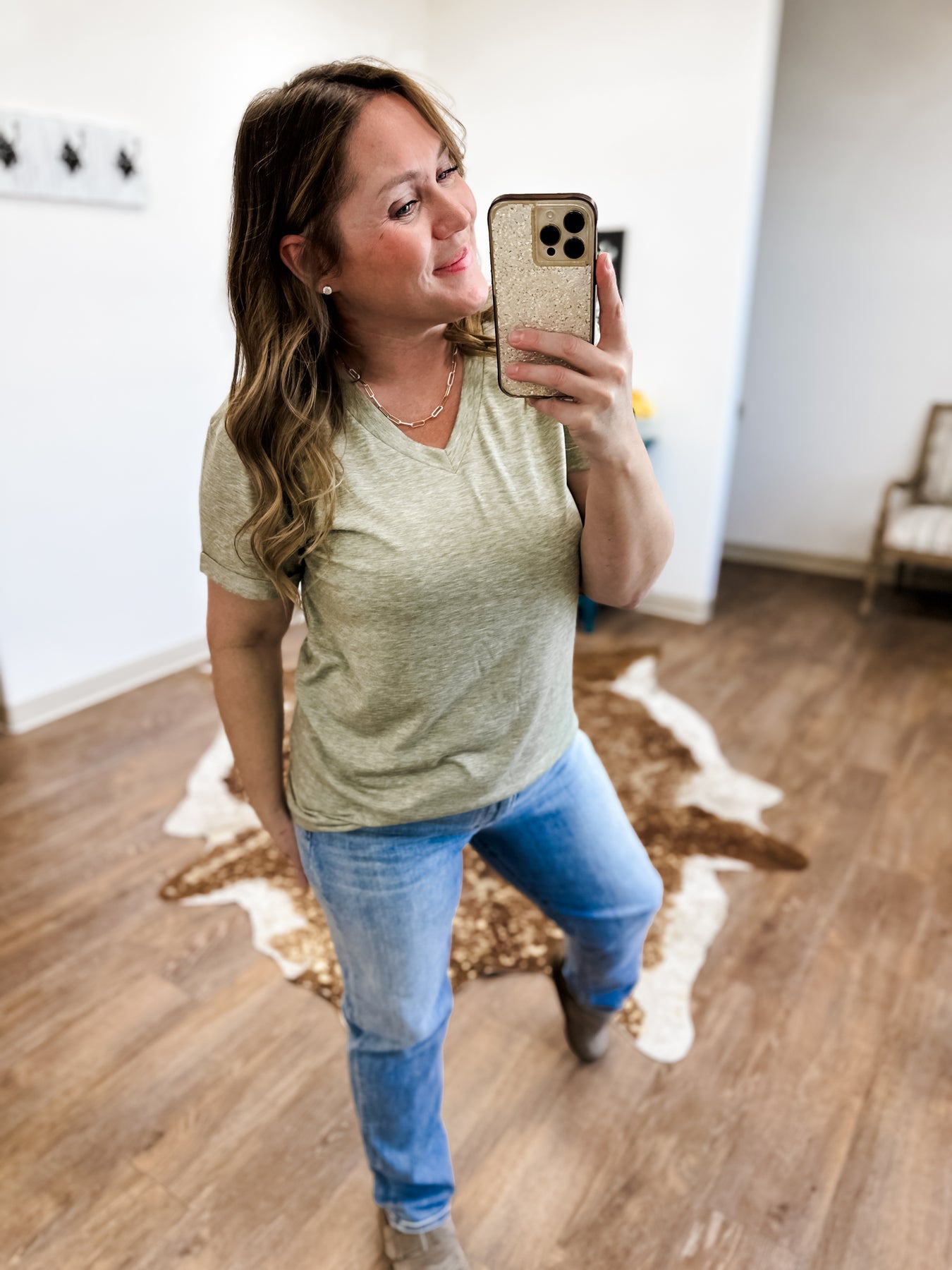 Girl… this tee is so good. It’s one of those soft, easy, throw-it-on-and-you’re-done tops that just makes getting dressed feel simple.  The heathering gives it that lived-in, effortless vibe, and the little cuffed sleeves?  Ugh, they’re adorable.  Just enough detail to make it feel elevated without trying.