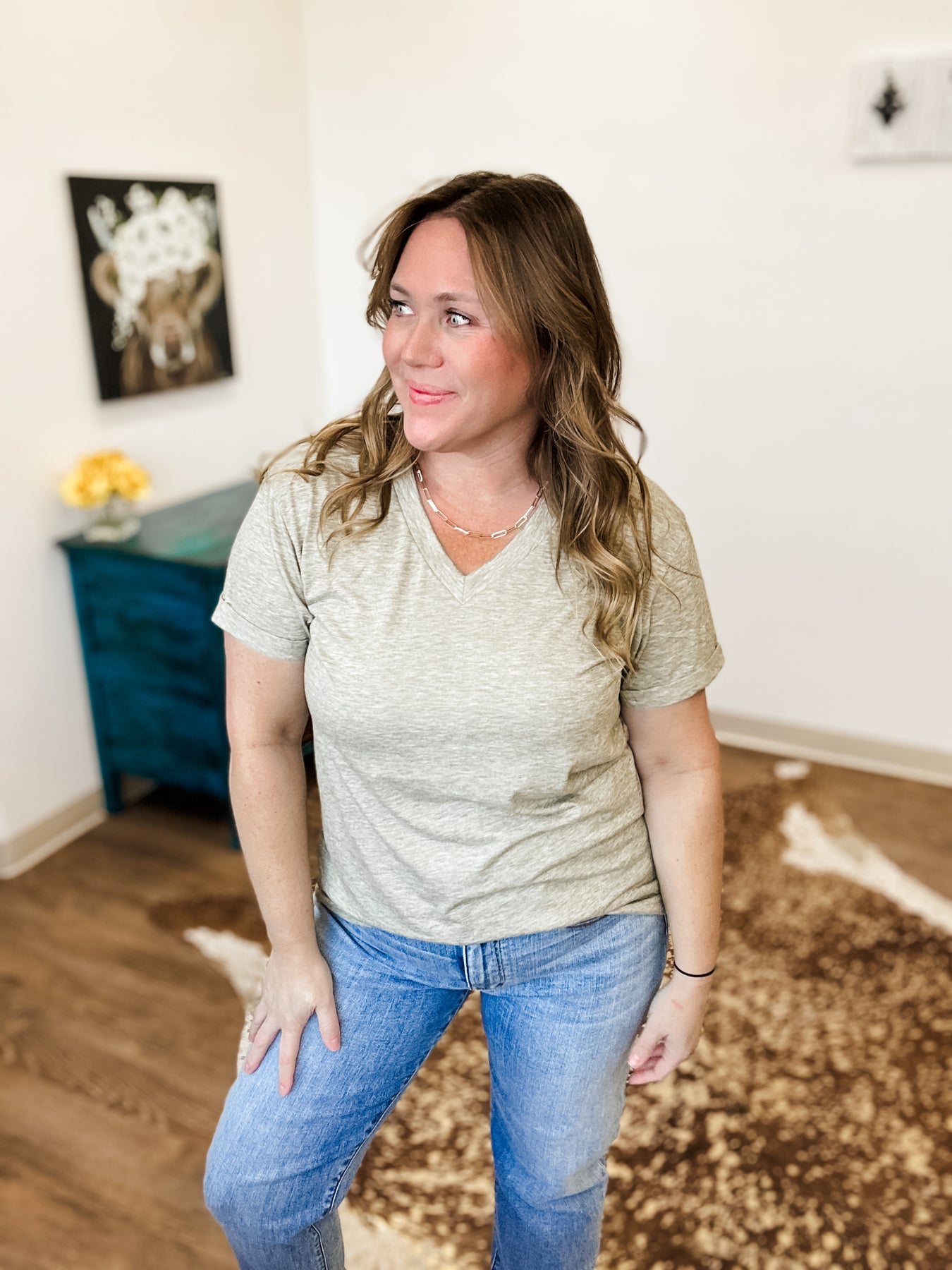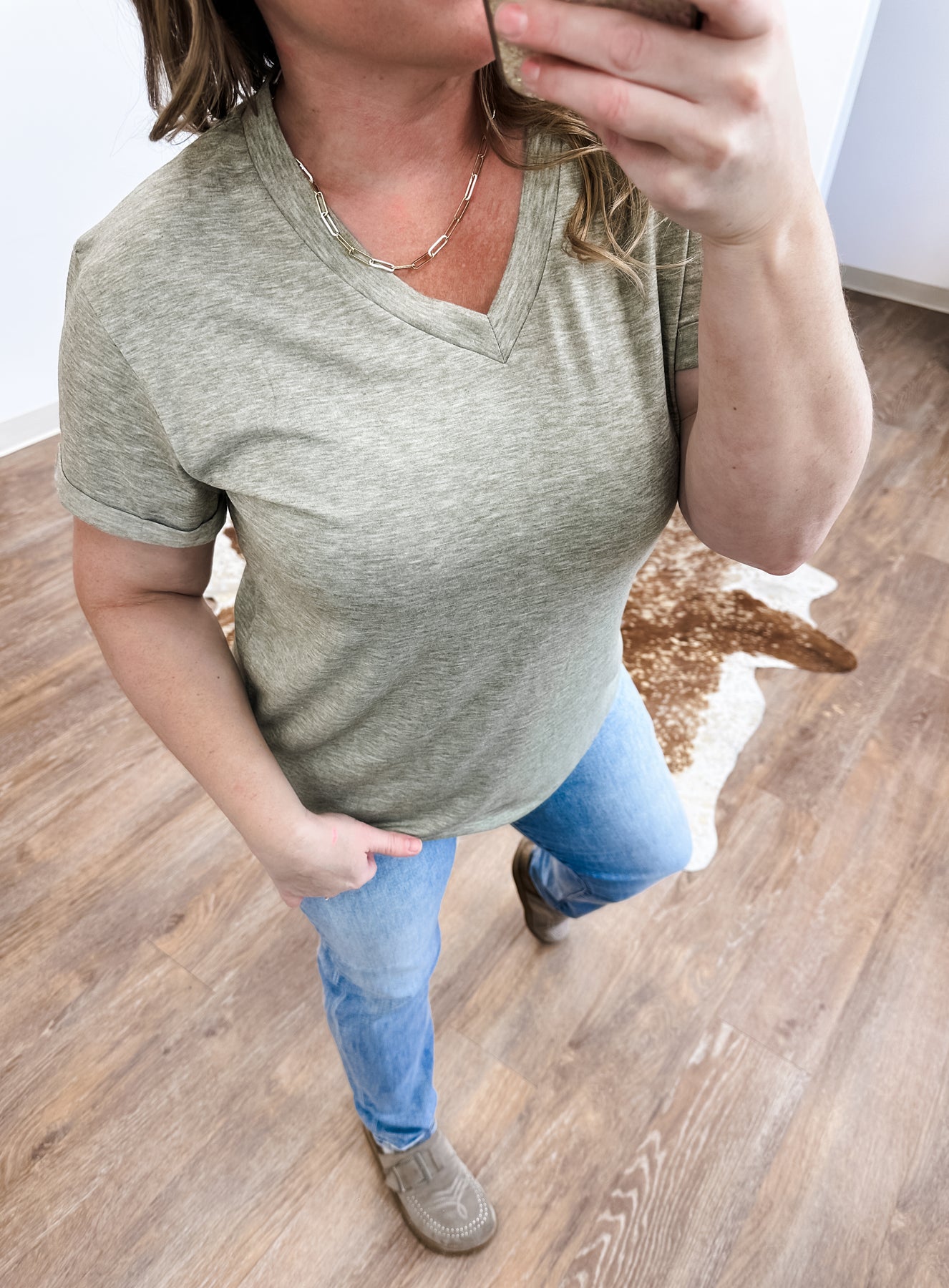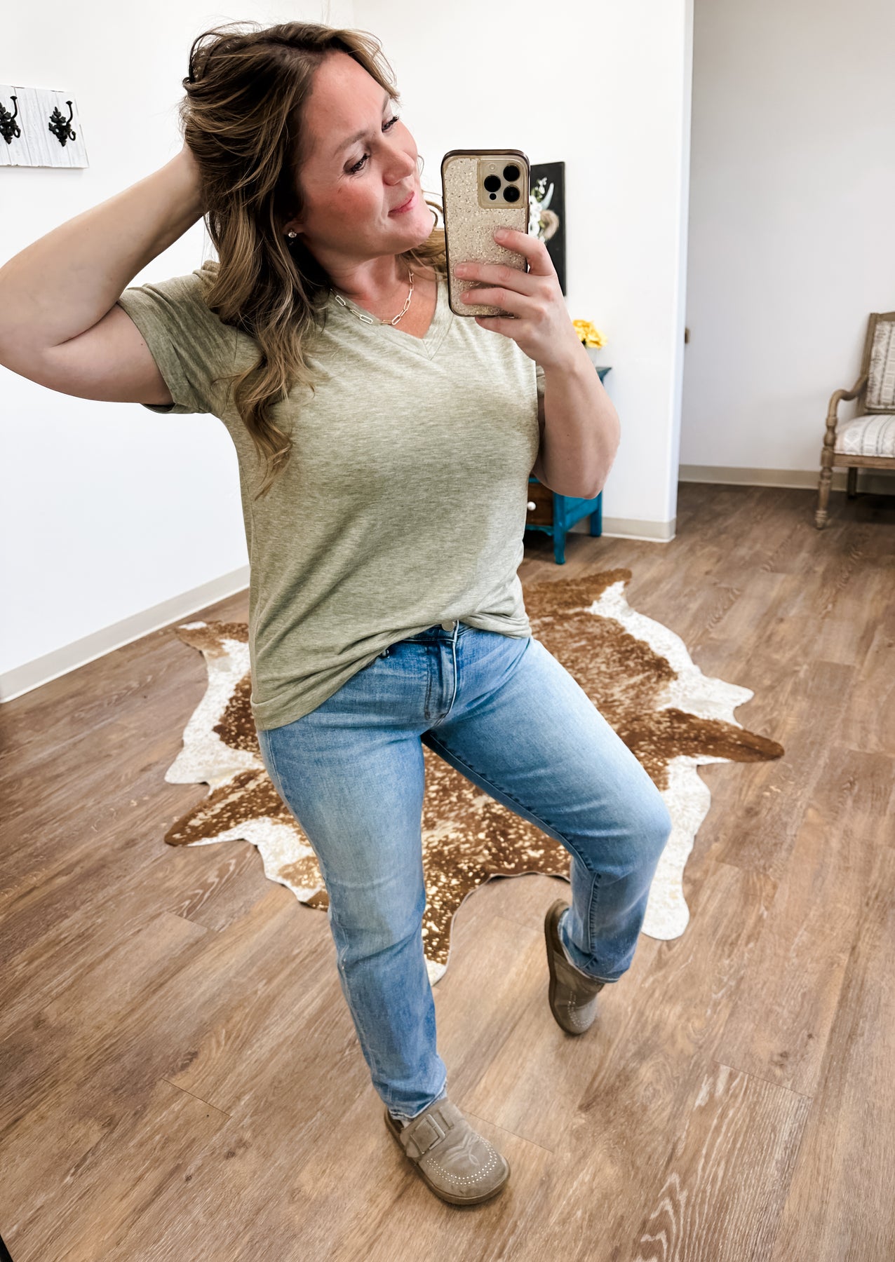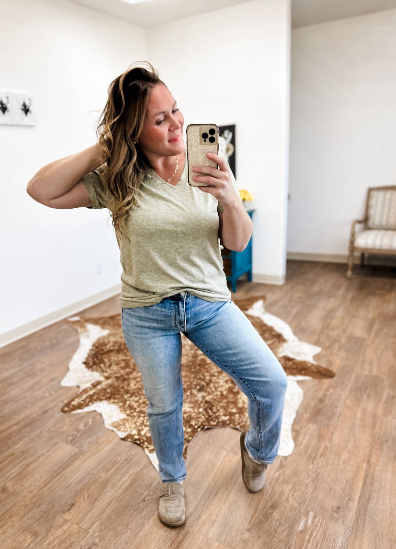 Girl… this tee is so good. It’s one of those soft, easy, throw-it-on-and-you’re-done tops that just makes getting dressed feel simple.  The heathering gives it that lived-in, effortless vibe, and the little cuffed sleeves?  Ugh, they’re adorable.  Just enough detail to make it feel elevated without trying.